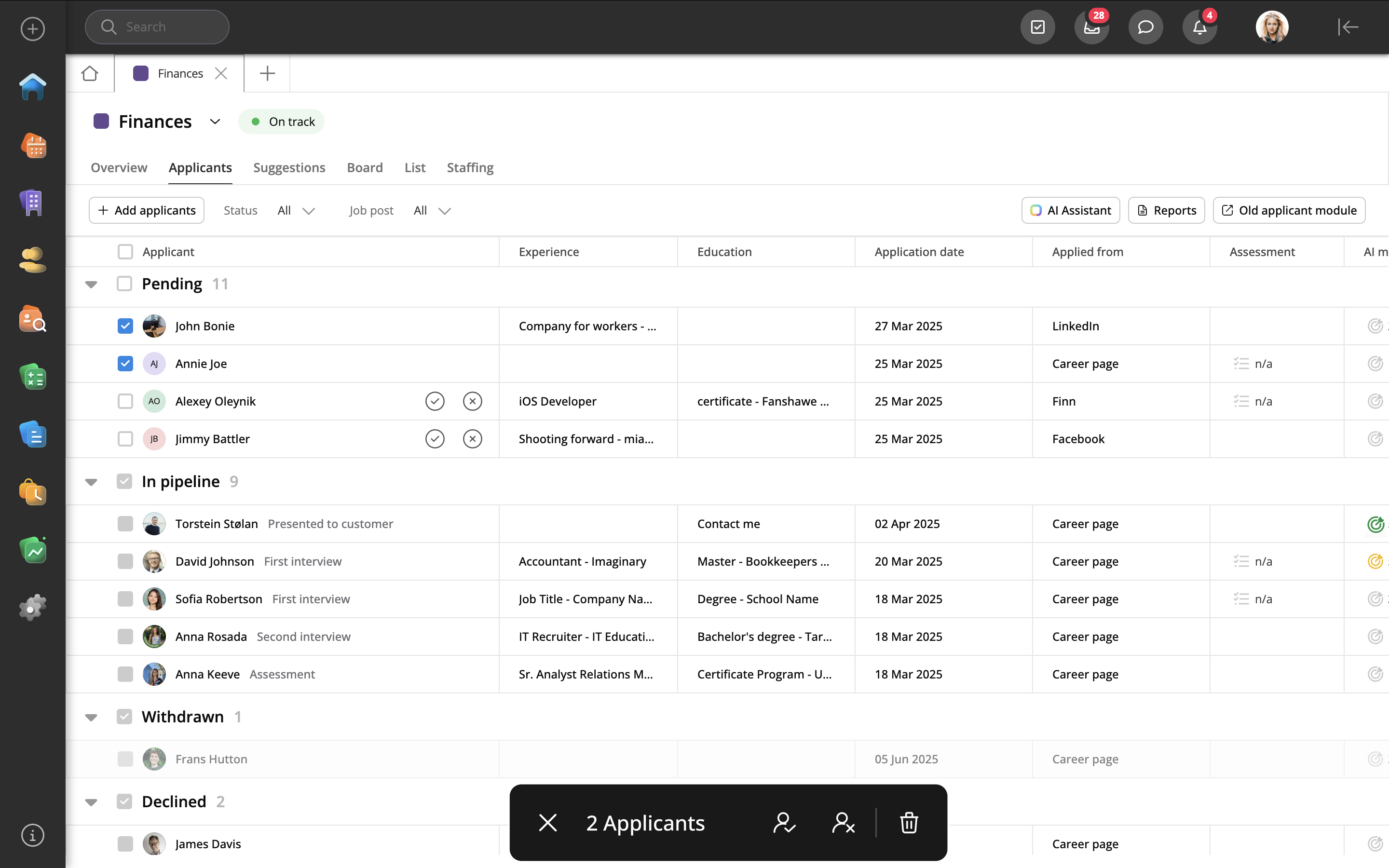 La pestaña Aplicantes facilita su flujo de trabajo de reclutamiento al priorizar a los candidatos que requieren atención inmediata y agruparlos según corresponda. De forma predeterminada, los aplicantes se agrupan según su estado actual, en lugar de por puesto de trabajo. Los aplicantes no procesados se muestran en la parte superior de la lista para garantizar una visibilidad inmediata. Dentro de cada grupo de estado, los aplicantes se ordenan del más reciente al más antiguo. Además, hay acciones en bloque disponibles para los aplicantes seleccionados, como moverlos a una etapa específica del pipeline, descartarlos, enviar un correo electrónico o eliminarlos.