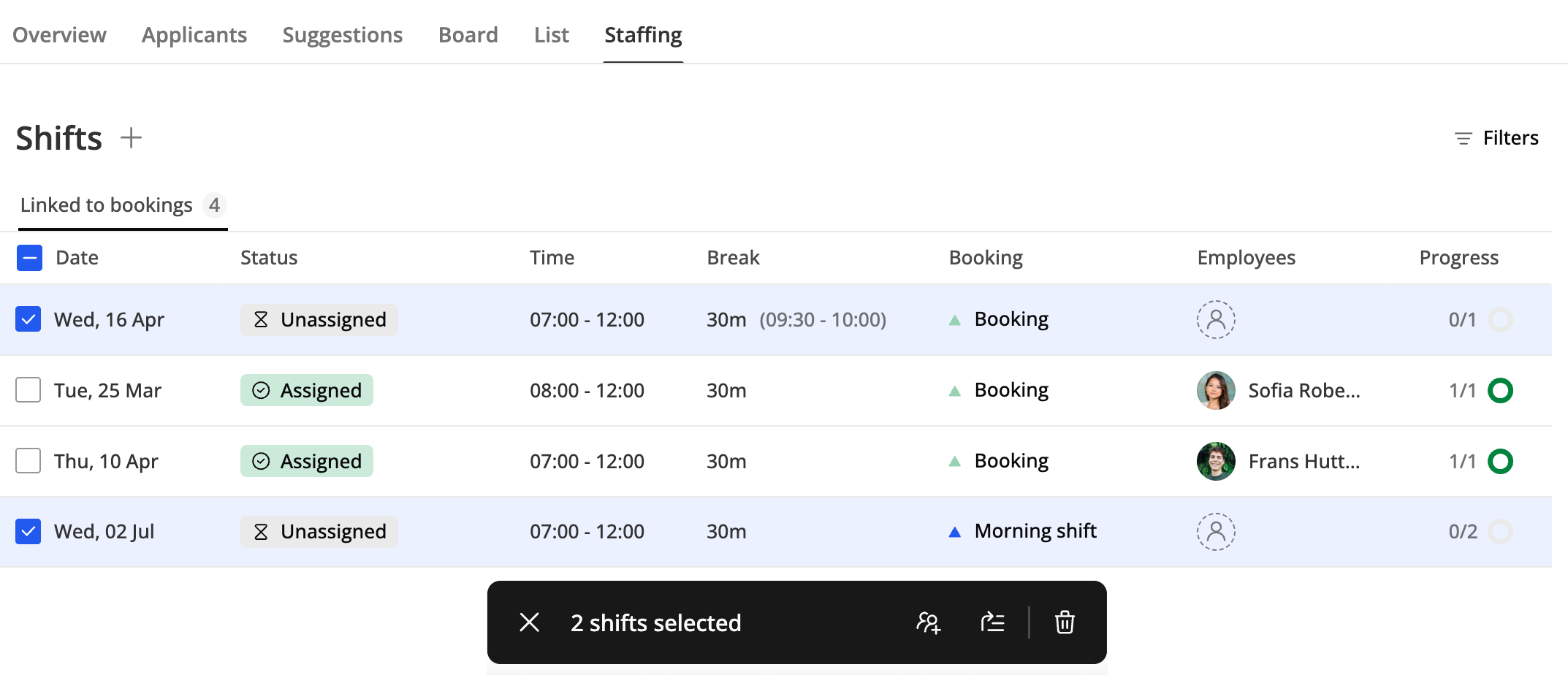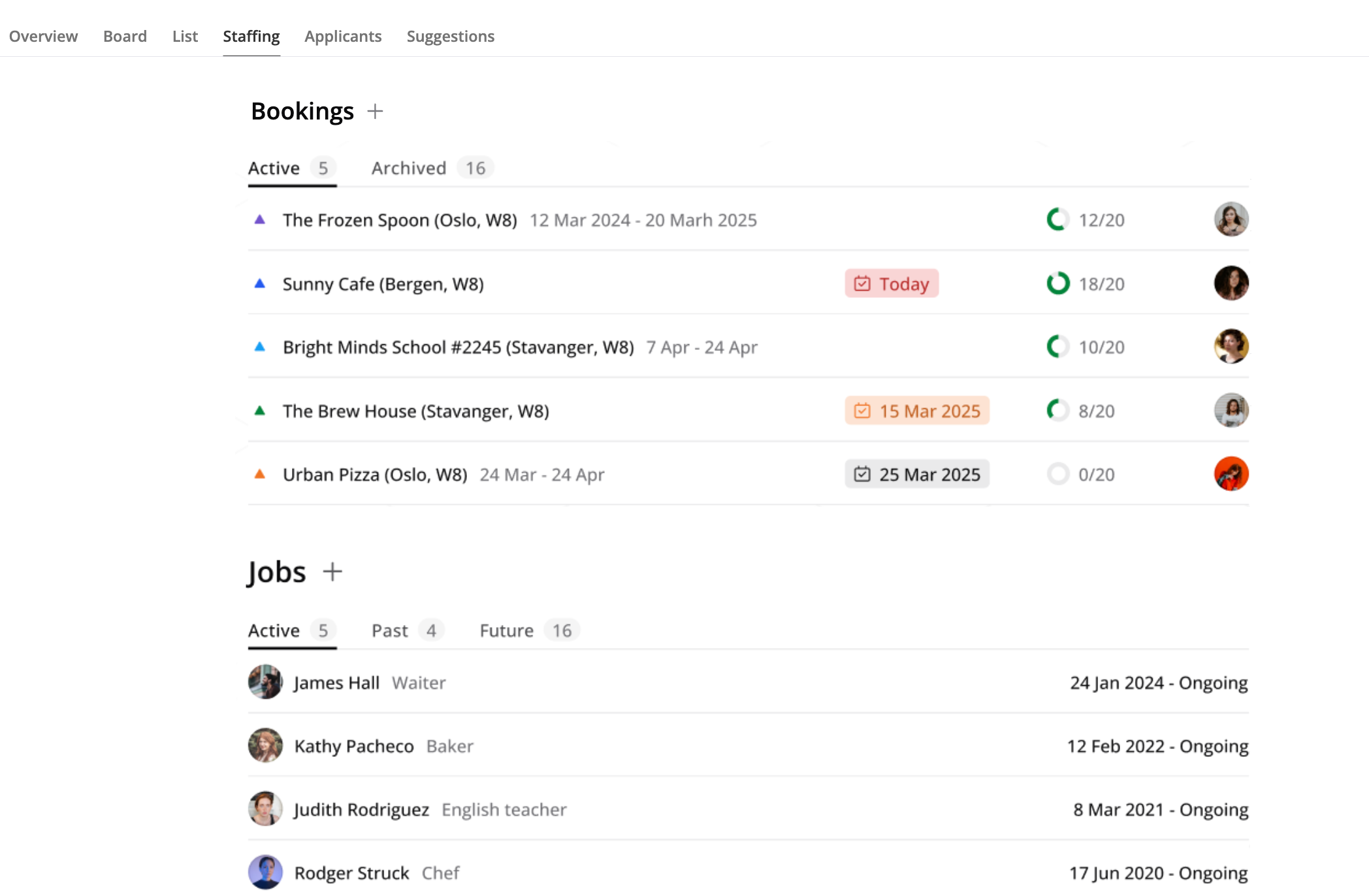 Esta pestaña aparecerá para proyectos con tipos de gestión de personal o reclutamiento y gestión. Desde esta pestaña, puede gestionar turnos, crear reservas y ver reservas activas/inactivas, además de acceder a una lista de trabajos, con su estado y detalles clave. Haga clic en el nombre del empleado o título del trabajo para abrir los paneles correspondientes.