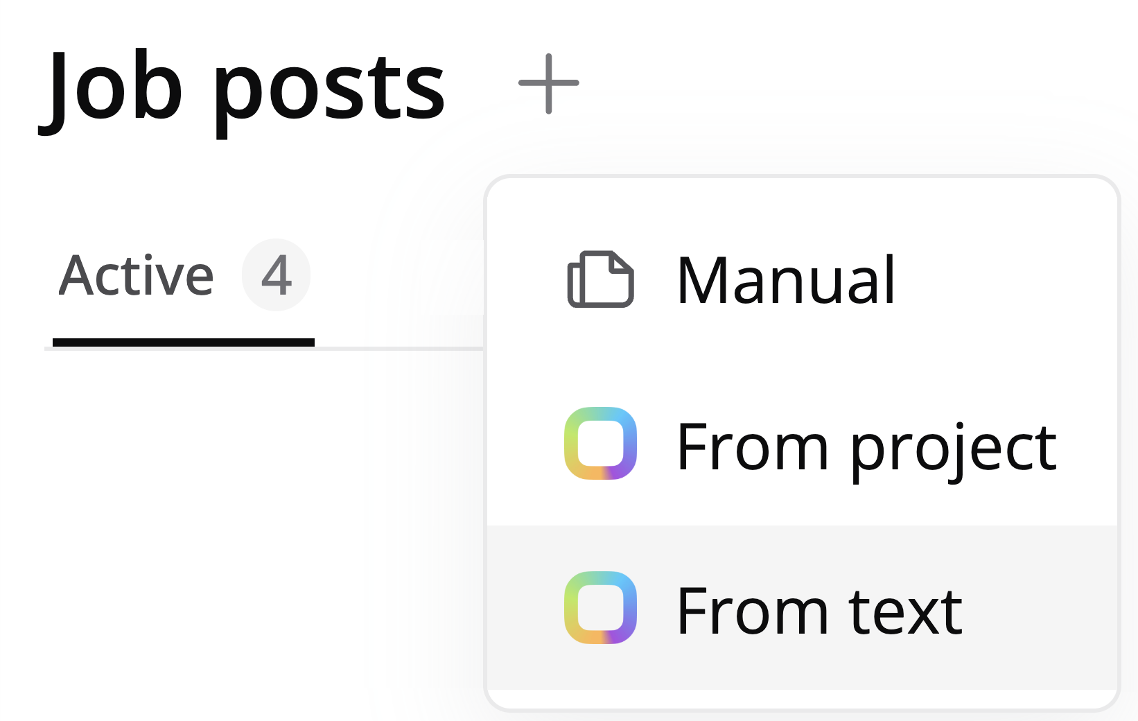 La función de generación de ofertas de empleo con asistencia de IA le permite crear rápidamente publicaciones atractivas, utilizando la información existente del proyecto o un texto personalizado. Esta función reduce significativamente el tiempo necesario para crear publicaciones profesionales, garantizando que estén alineadas con los requisitos de su proyecto. Tenga en cuenta que para crear publicaciones de empleo a partir de la información del proyecto se requiere que se configure un Perfil de Reclutamiento en el asistente de IA. Si no se configura ningún perfil, solo estará disponible la opción de creación basada en texto con IA.