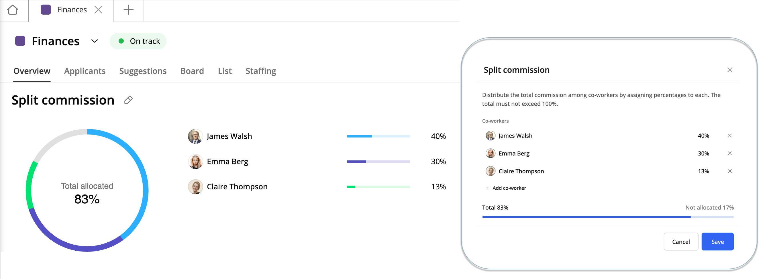 La funcionalidad de comisión dividida le permite asignar porcentajes flexibles y especificar fácilmente qué compañeros de trabajo reciben comisión. Puede distribuir cualquier cantidad (que no supere el 100%) de los ingresos o margen de contribución del proyecto que se ajuste a su estructura de comisiones.