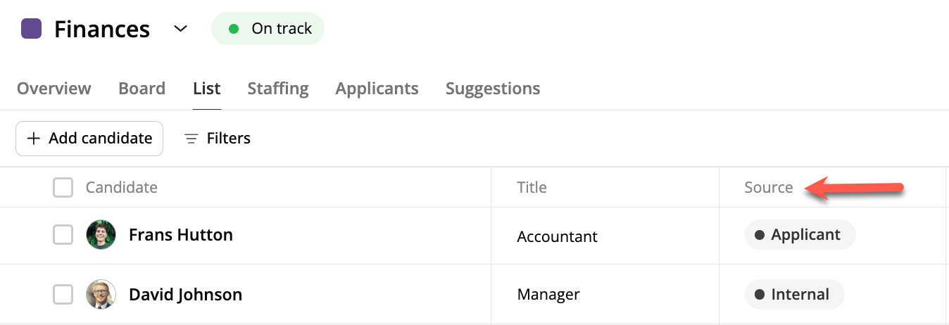 El rastreo de fuente se aplica a todos los candidatos añadidos a proyectos después del 26 de mayo de 2025. Los candidatos que se añadieron antes de esta versión no mostrarán información sobre su fuente.