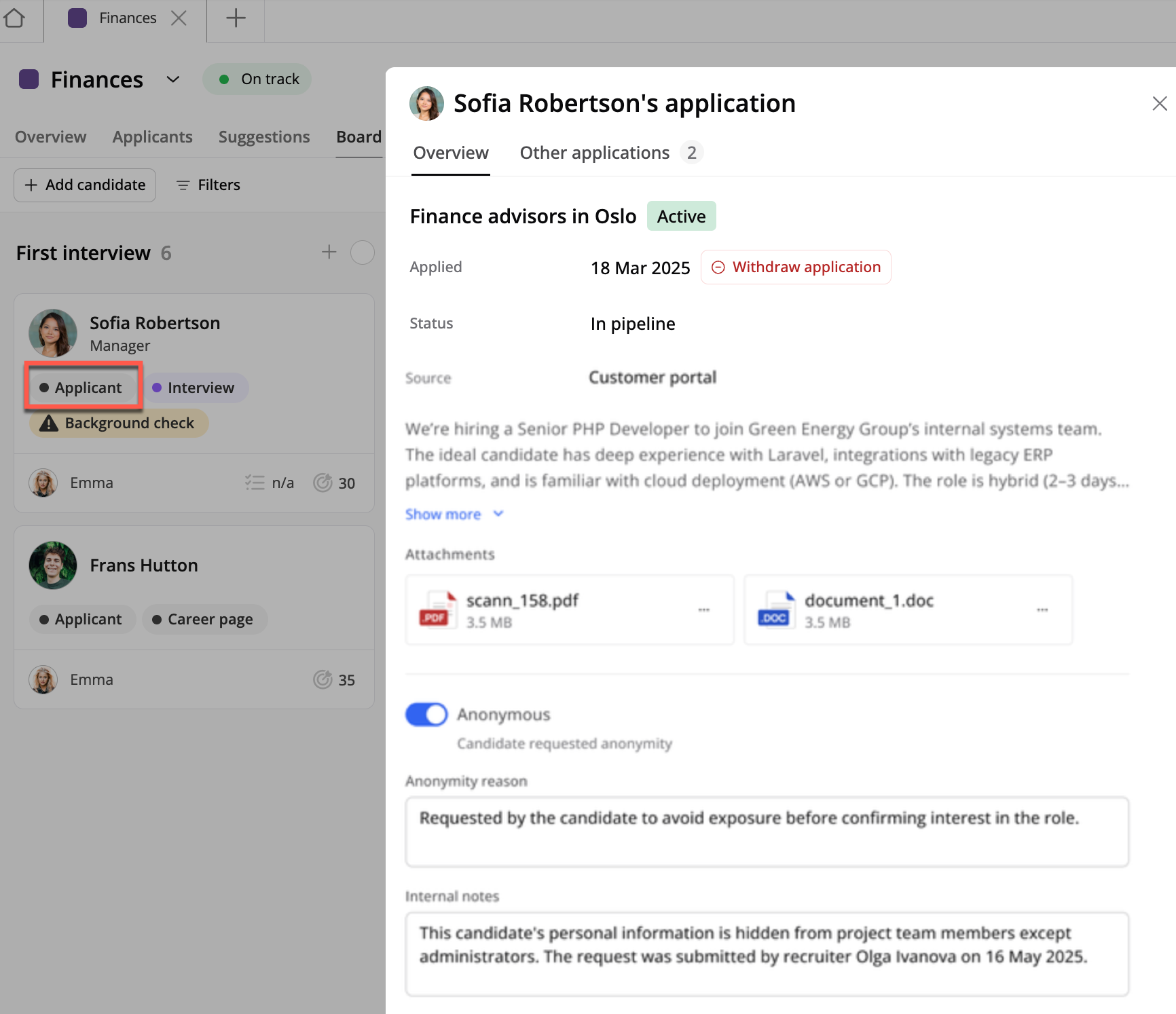 Puede revisar, aceptar o rechazar solicitudes de anonimato provenientes de listas públicas de solicitudes. Hay campos adicionales para el motivo de esta decisión y notas internas. Asegúrese de seleccionar el sector público en la configuración de su publicación de empleo para que esta función esté disponible. El estado de privacidad del aplicante puede reconocerse por el icono de anonimato ubicado en las tarjetas de candidatos en el Tablero y junto a los nombres en la lista de Aplicantes.