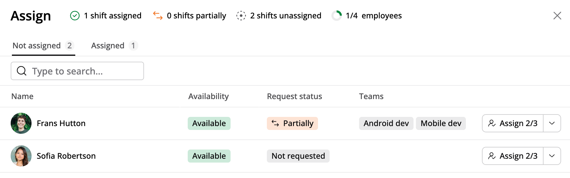 Usando el modal de asignación, puede ver la disponibilidad de cada empleado, el estado de solicitud y a que equipo pertenece.