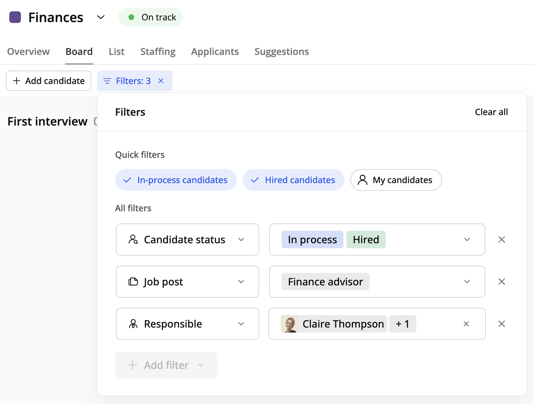 • Filtrar por persona(s) responsable(s) para ver candidatos asignados a miembros específicos del equipo.