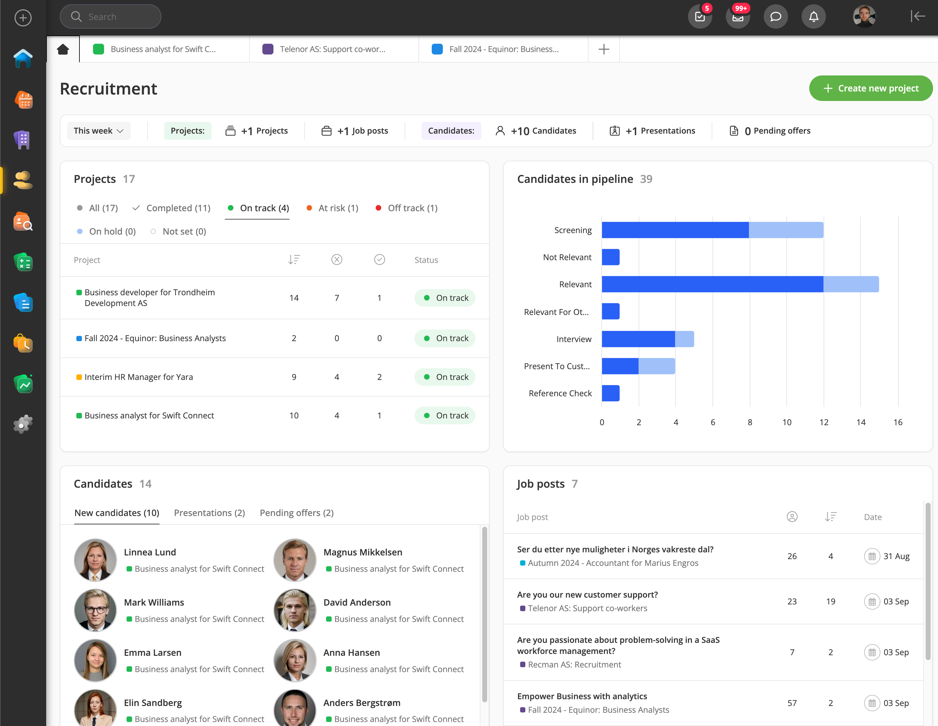 El módulo le proporciona un panel de control con una vista general de sus proyectos y su estado, un pipeline que muestra el número de candidatos que actualmente se están procesando en las diversas categorías, y una visión rápida de nuevos candidatos, presentaciones, ofertas de reclutamiento y publicaciones de empleo. Haga clic en los nombres de los proyectos para acceder al pipeline del proyecto.