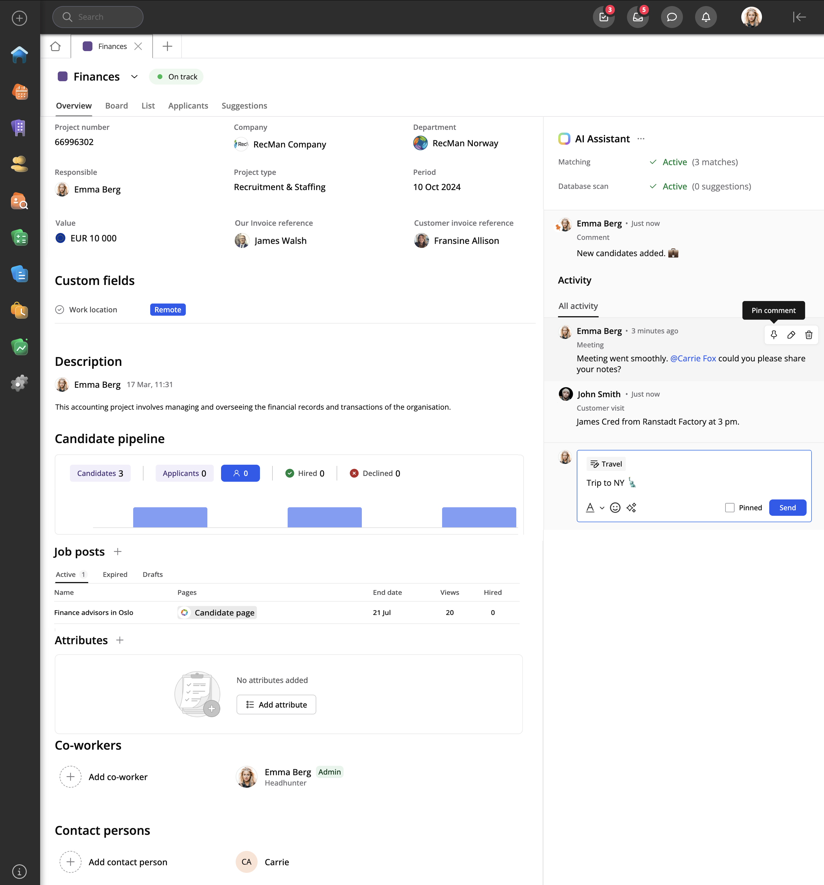 La vista general proporciona información general sobre su proyecto. Aquí también encontrará campos personalizados, estadísticas de candidatos (pipeline), atributos del proyecto, compañeros de trabajo y personas de contacto. Tendrá acceso rápido a detalles clave y a la edición de las ofertas de empleo vinculadas a este proyecto, y podrá también añadir nuevas. Los administradores del proyecto pueden editar la información del proyecto directamente en la vista general o usar la opción Editar proyecto en el menú desplegable junto al nombre del proyecto.