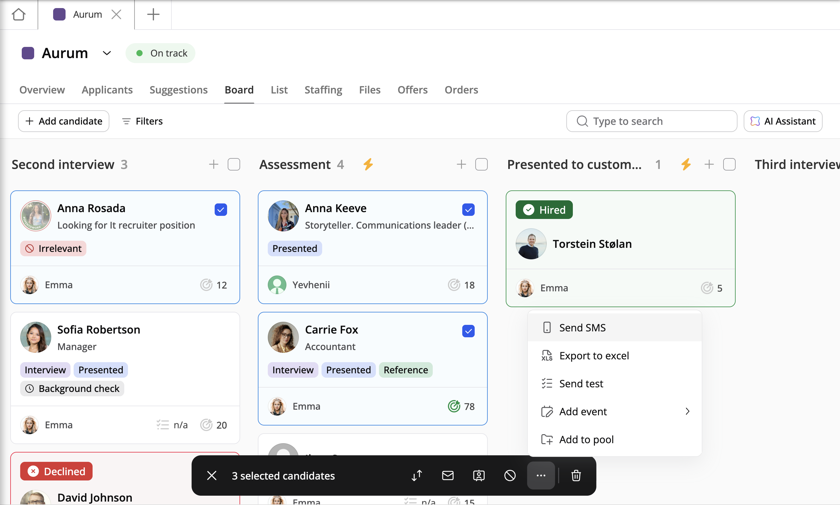 La vista de tablero es una excelente manera de obtener una representación visual del pipeline de candidatos. Desde aquí, puede moverlos mediante arrastrar y soltar o seleccionar varios a la vez para que se muestre la barra de acciones. Utilizando la barra de acción, puede mover varios candidatos a la vez, enviar correo electrónico/SMS, presentarlos, descartar candidatos, exportar a Excel, enviar pruebas de evaluación, agregar un evento, agregarlos al grupo o eliminar candidatos del pipeline.