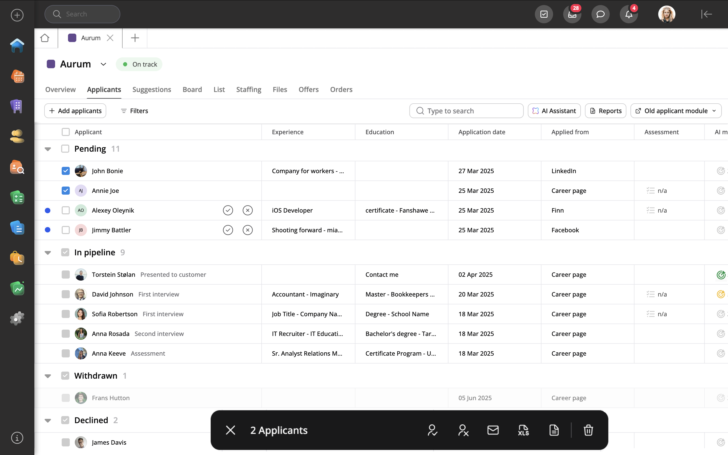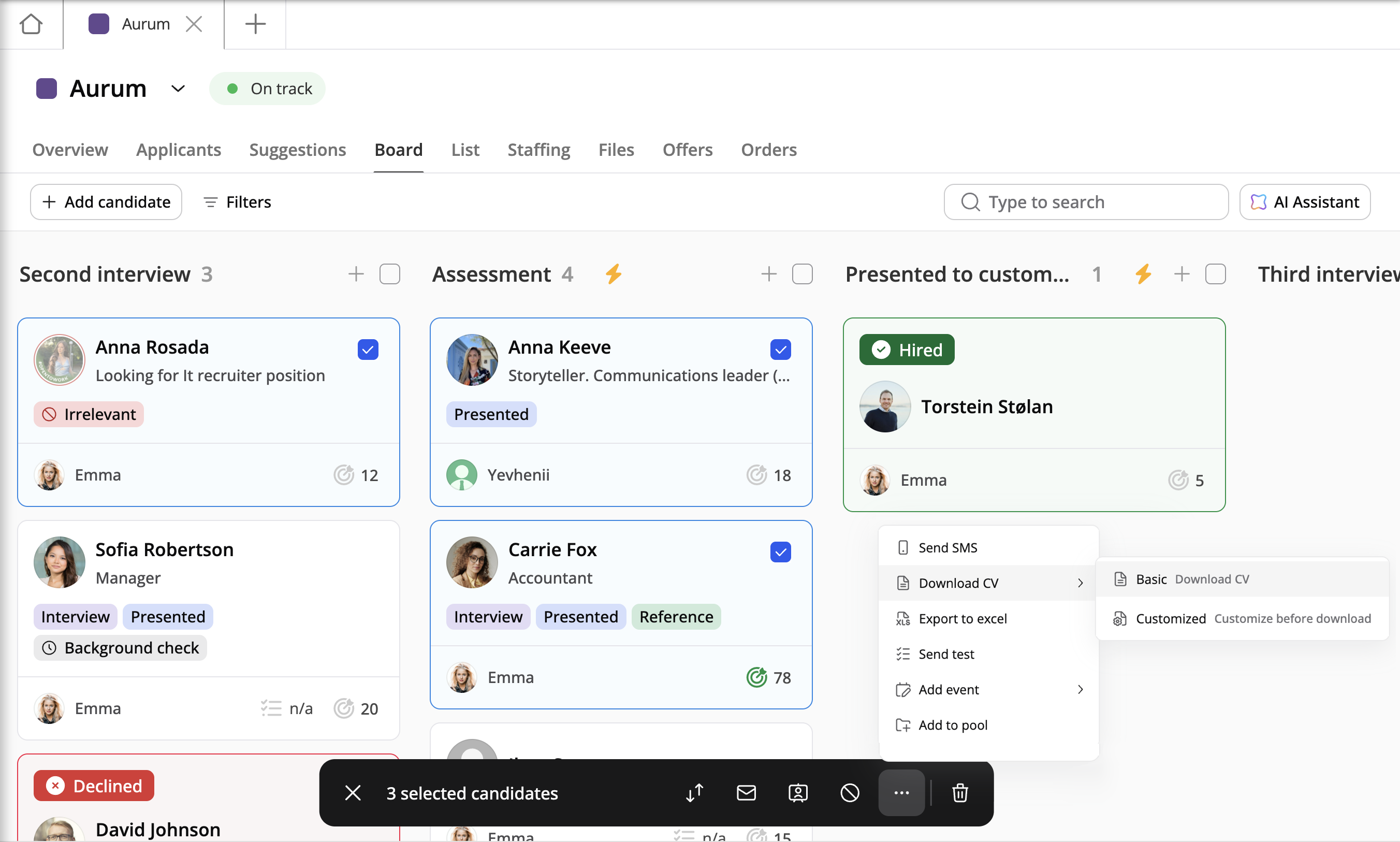 La vista de tablero es una excelente manera de obtener una representación visual del pipeline de candidatos. Desde aquí, puede moverlos mediante arrastrar y soltar o seleccionar varios a la vez para que se muestre la barra de acciones. Utilizando la barra de acción, puede mover varios candidatos a la vez, enviar correo electrónico/SMS, descargar CV personalizados, presentarlos, descartar candidatos, exportar a Excel, enviar pruebas de evaluación, agregar un evento, agregarlos al grupo o eliminar candidatos del pipeline.