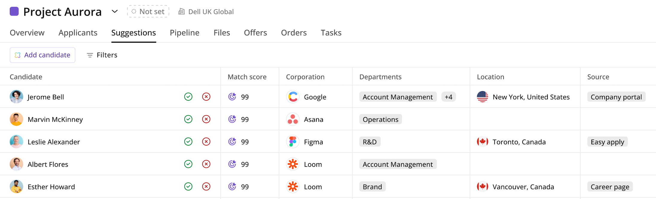 Puede rastrear e identificar la fuente a través de la cual los candidatos ingresan a su proceso de reclutamiento. Esta función ofrece una mejor visibilidad de la efectividad de su búsqueda. Todos los puntos de entrada de candidatos, incluyendo aplicaciones directas, adiciones manuales, recomendaciones de IA, envíos por portal del cliente y más, son capturados. La fuente aparece como una etiqueta en las tarjetas de candidatos para reconocimiento rápido y en la columna "Fuente" en la vista de lista de candidatos.