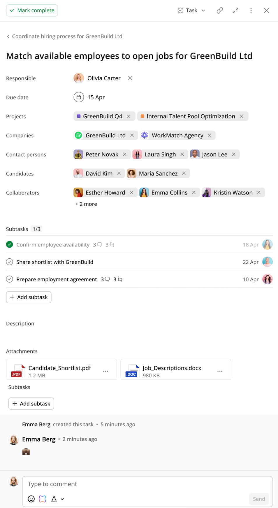 Las tareas están completamente integradas dentro del contexto de tu proyecto. Cuando haces clic en una tarjeta de tarea, se abre un panel donde puedes asignar responsables, vincular tareas a candidatos, empresas o contactos relevantes, agregar archivos adjuntos y mantener toda la comunicación en un solo lugar.