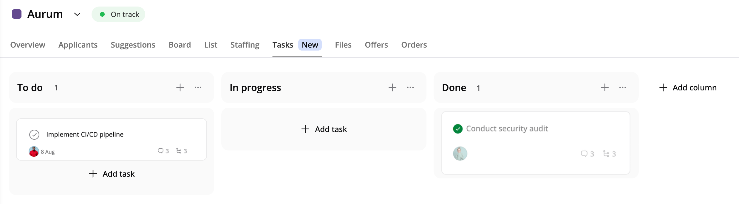 La pestaña Tareas te permite crear y gestionar tareas dentro de un proyecto, organizándolas por estado en un tablero visual estilo Kanban, para asegurar que todo lo relacionado con tu trabajo se mantenga conectado y sea fácil de monitorear. Puedes mover las tarjetas entre columnas mediante arrastrar y soltar. Haz clic en el botón de marca de verificación para marcar la tarea como completada.