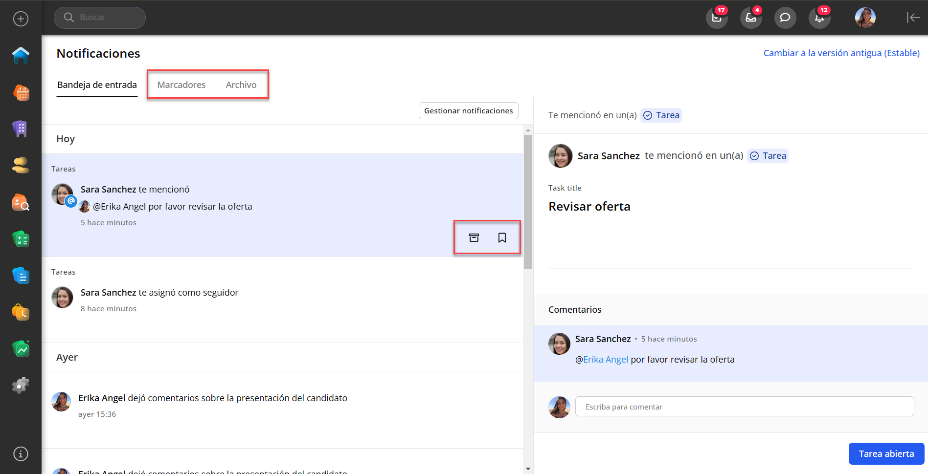 Puedes mover fácilmente una notificación al archivo si no quieres que aparezca más en tu bandeja de entrada o, por el contrario, marcarla si es importante. Para hacerlo, simplemente haz clic en el ícono correspondiente ubicado en la esquina superior derecha de la notificación.
