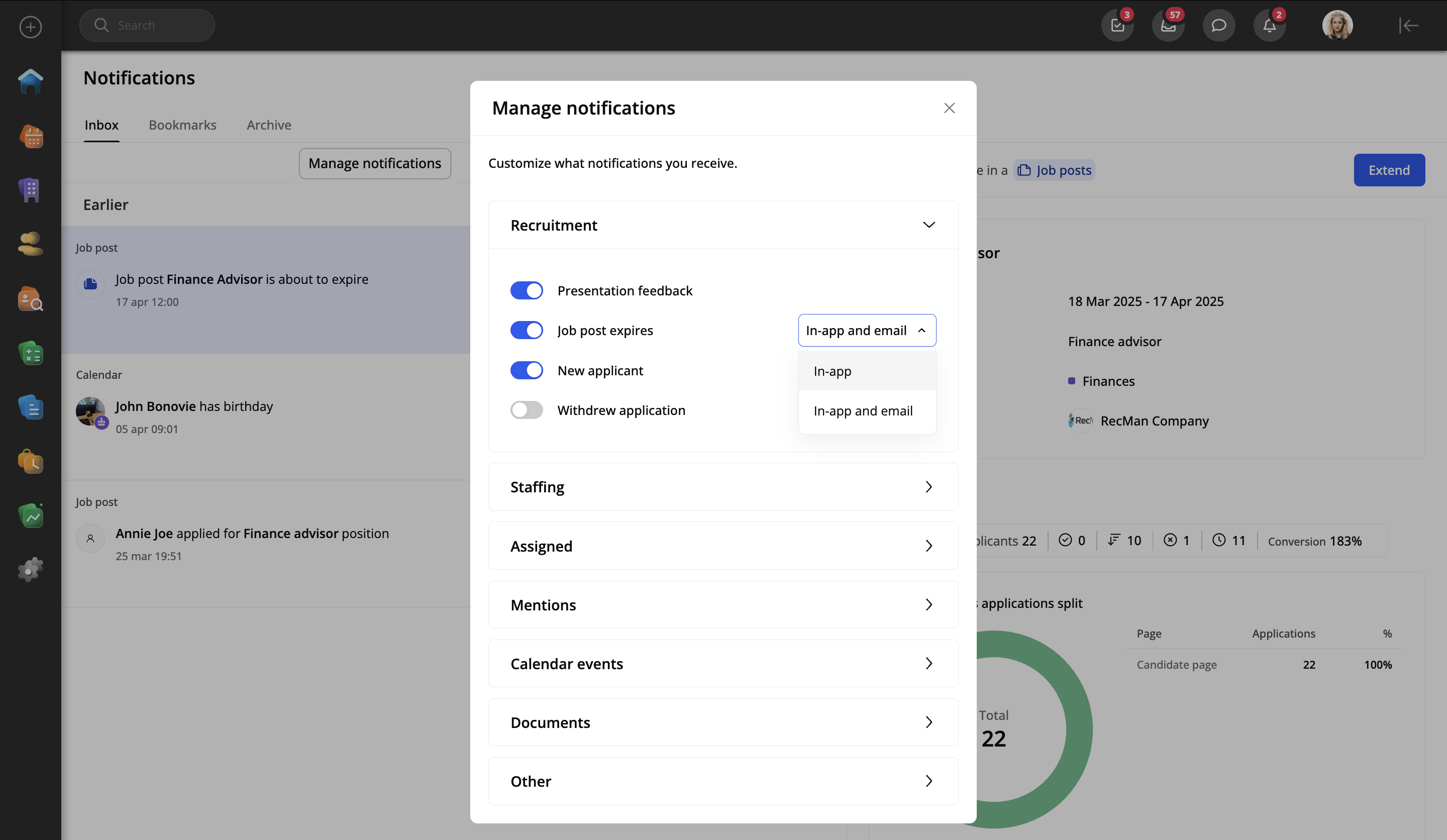 El botón Gestionar notificaciones le permite personalizar las notificaciones que recibe. Estas están organizadas en categorías como reclutamiento, gestión de personal, menciones y más. Si la opción está habilitada, recibirá notificaciones directamente en RecMan (notificaciones en la aplicación). Además, para los tipos que se enumeran a continuación, también existe la opción de recibirlas por correo electrónico.