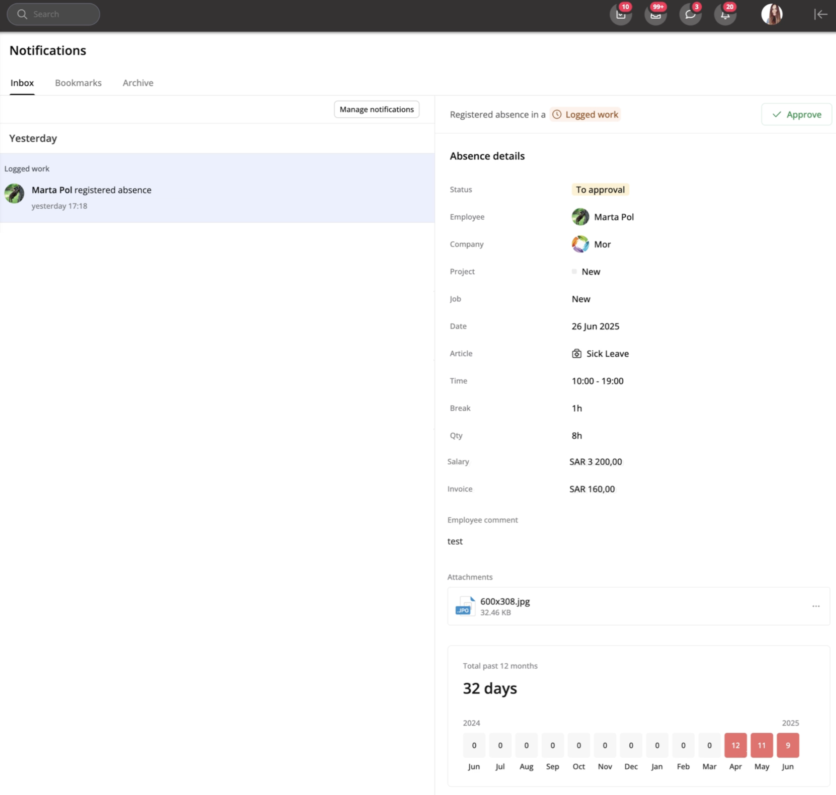 Puede aprobar la solicitud de ausencia directamente desde la notificación sin necesidad de navegar a otro lugar.