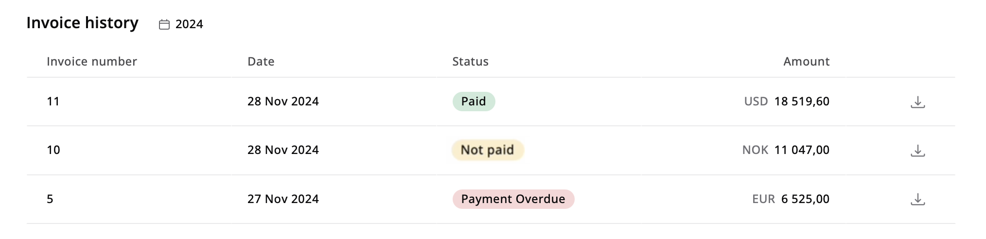 Esta función le permite acceder a una tabla completa que muestra todas sus facturas, incluyendo su número, fecha, estado (pagado, no pagado o pago vencido) y monto. Además, podrá descargar fácilmente versiones en PDF de las facturas para sus registros. Tan pronto como se genere una factura, se incluirá en esta tabla con el estado predeterminado No pagado. Luego, RecMan procesará el pago de esta factura con su tarjeta principal y cambiará el estado a Pagado.