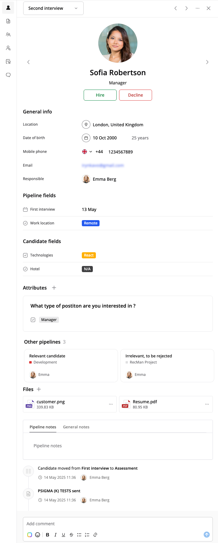 Esta función permite cargar archivos directamente en los registros del candidato y acceder fácilmente a currículums, portafolios, evaluaciones u otros documentos sin necesidad de navegar por diferentes secciones. También permite previsualizar los archivos al instante, reduciendo los tiempos de descarga y minimizando posibles riesgos de seguridad. Además, nuestra IA puede ayudar a analizar documentos complejos, proporcionando resúmenes y traducciones entre idiomas.