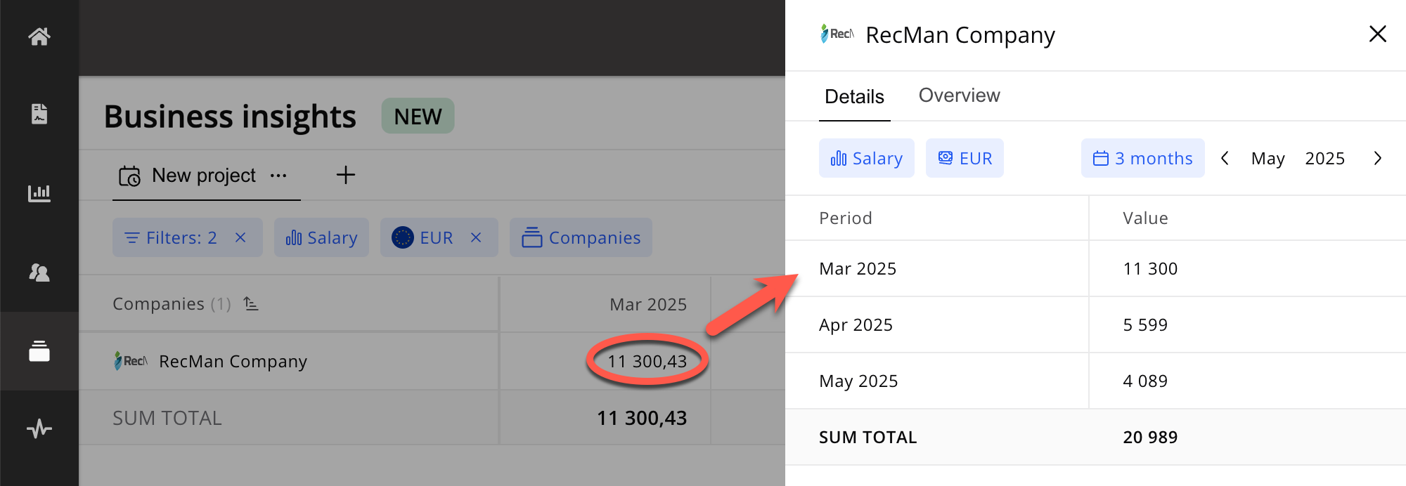 Los proyectos o empresas se mostrarán en un formato de cuadrícula intuitivo, organizado por mes y por el punto de datos seleccionado. Cada punto de datos se desglosa de forma mensual, con totales que permiten comparaciones rápidas y el análisis de tendencias.