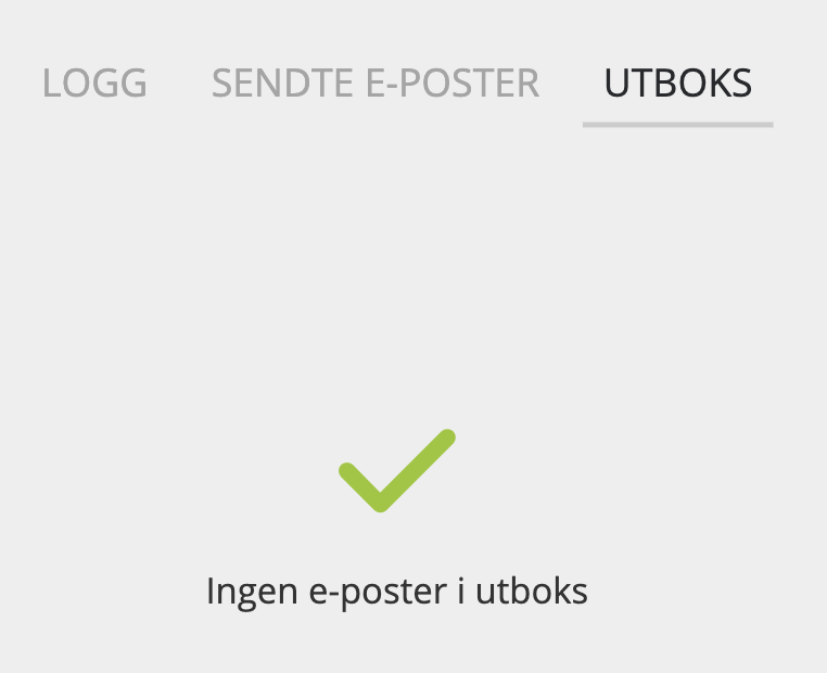Ved å trykke på Utboks, skal det se ut som bildet under. Hvis du skulle finne en e-post her, og e-posten ikke forlater utboksen, kan du trykke på e-posten for å lese om hva som forårsaker dette. Skulle e-posten bli værende over lengre tid, eller få en varseltrekant ved siden av, anbefaler vi at du tar kontakt med vår support for assistanse.