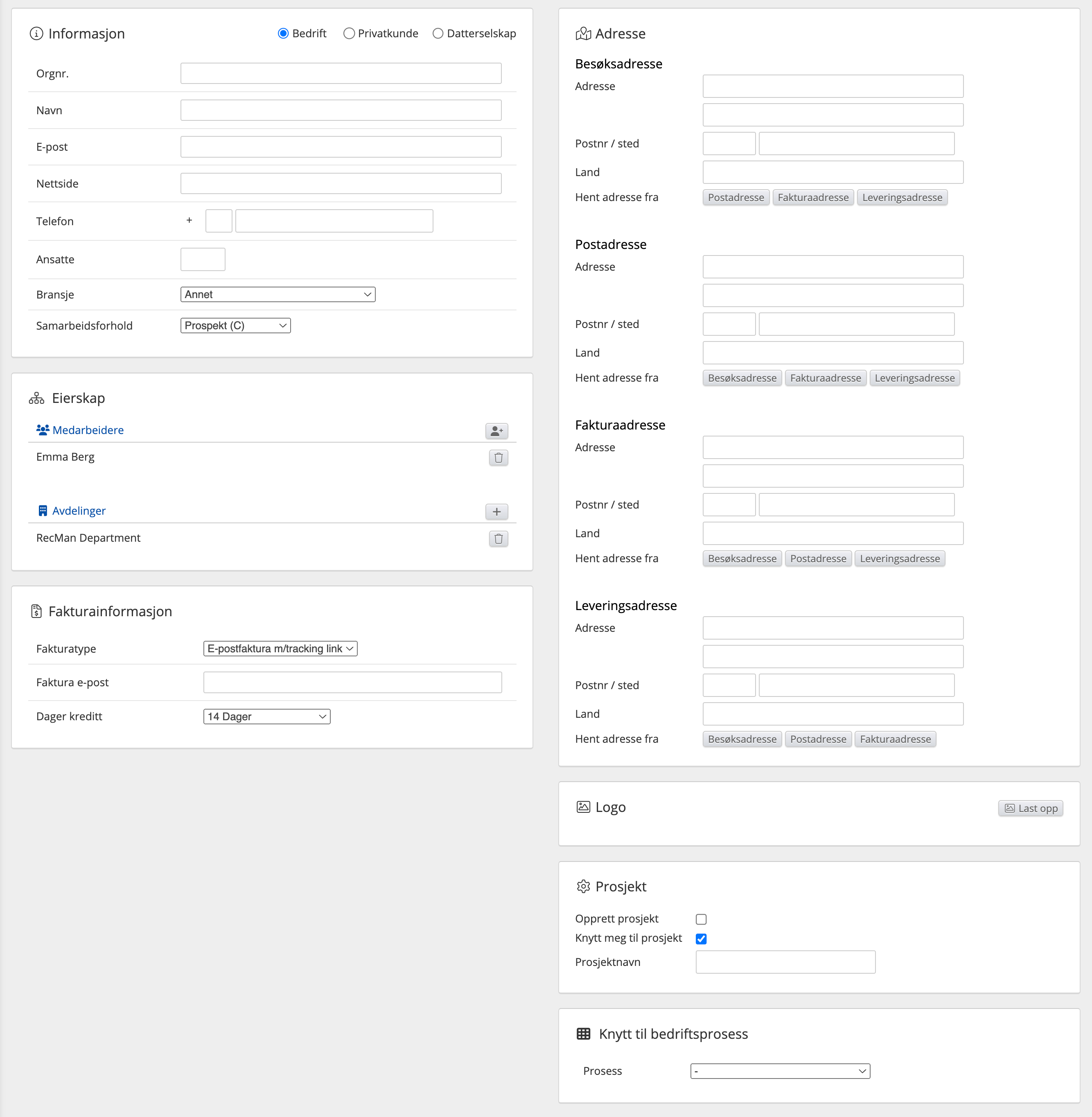 Her finner du generell informasjon om CRM, samt hovedfunksjoner og hvordan opprette en ny bedrift.