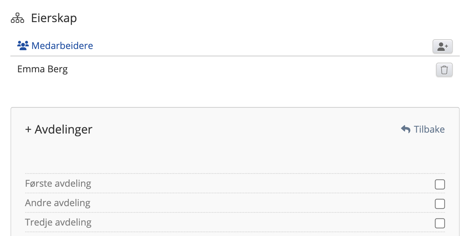 Du kan også velge hvilke medarbeidere som skal ha en tilhørighet til denne bedriften. Du kan legge til så mange personer som du selv ønsker. Velg fra listen, og trykk Legg til medarbeider. Dette brukes blant annet til å kunne filtrere på sine egne bedrifter for eksempel, eller for å vise hvem som “eier” kunden.