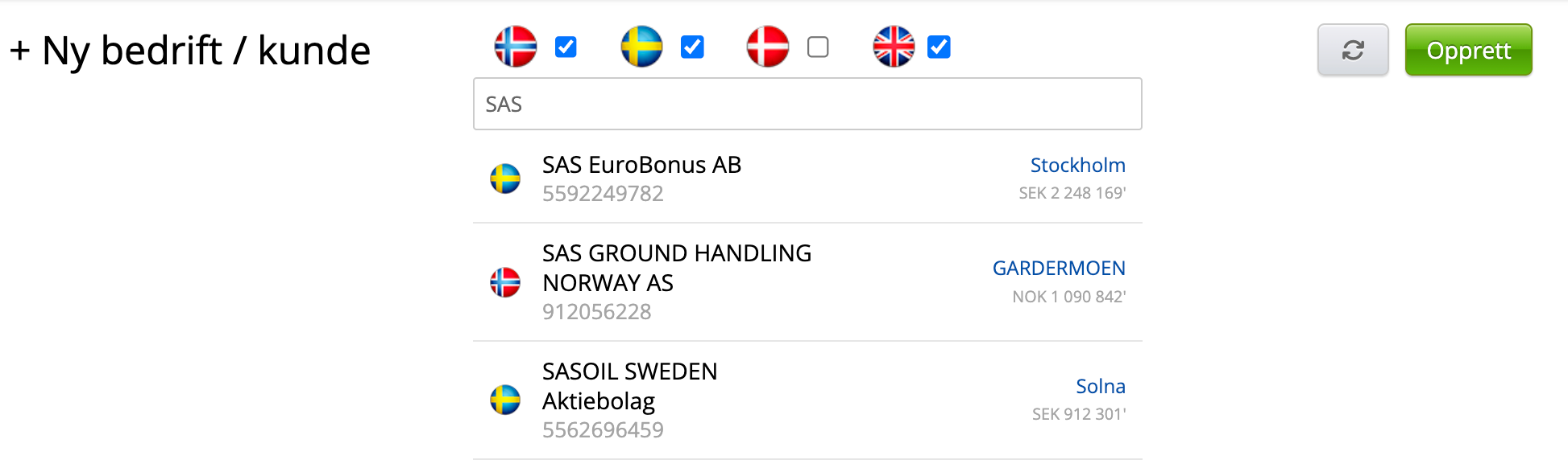 Som du kan se søker RecMan CDB i både Norge, Sverige, Danmark og Storbritannia. Dette gjør det enkelt å legge inn nye kunder, uansett hvor de befinner seg.