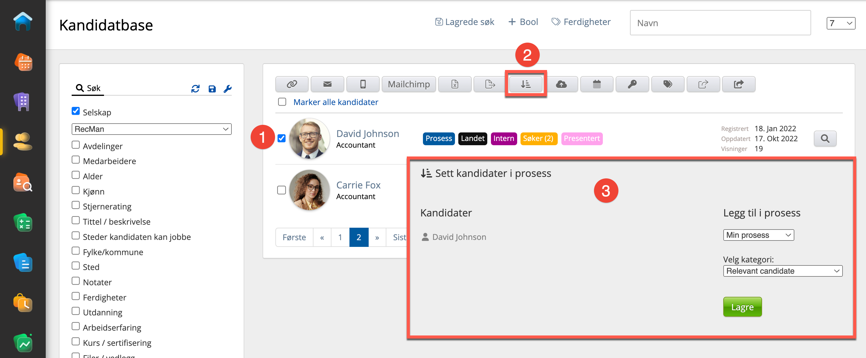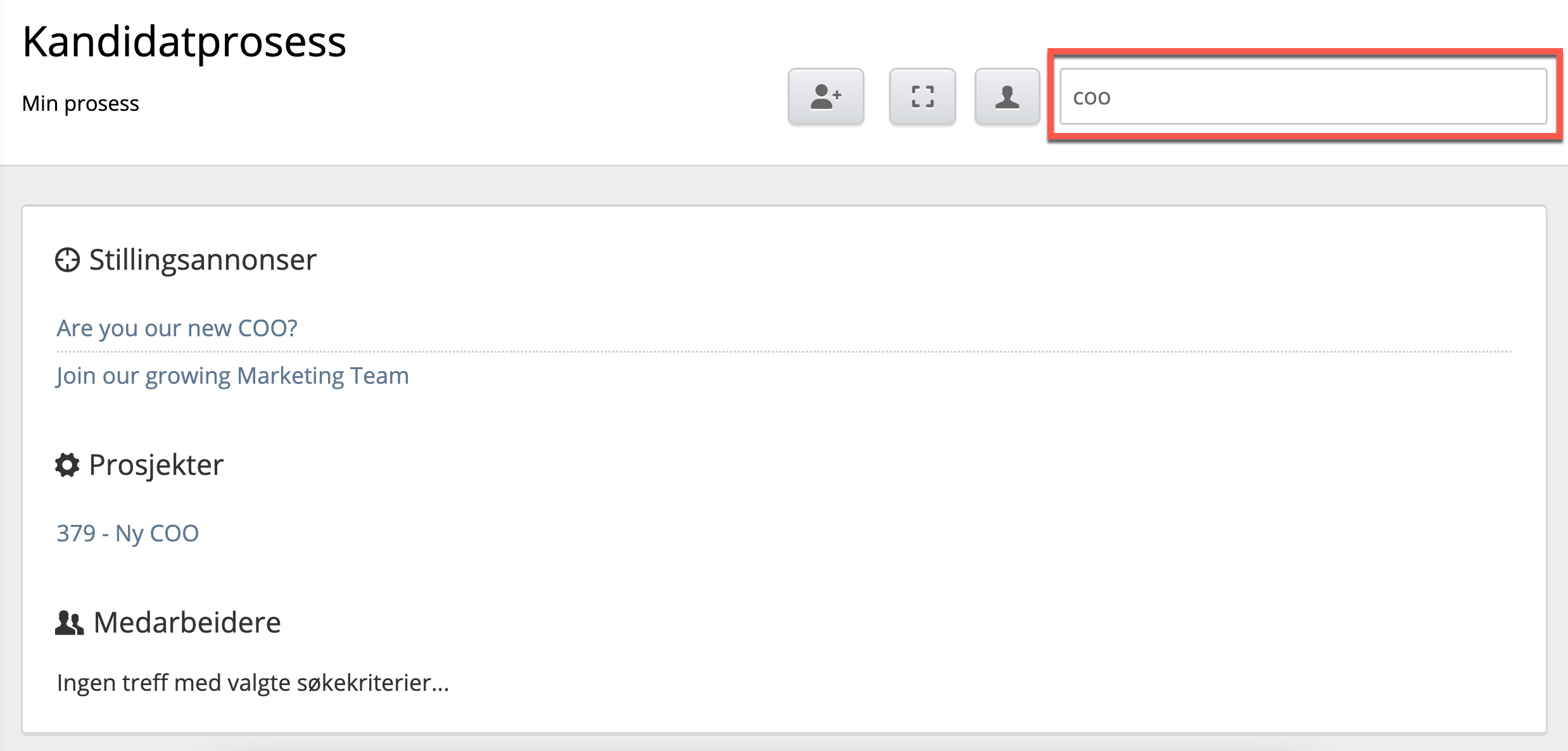 Til slutt finnes visningen Min prosess som viser alle kandidater du har i prosess uavhengig av hvilket prosjekt eller hvilken stillingsannonse kandidaten er i prosess i. Denne finner du enten ved å gå inn i kandidatbasen og så på Kandidatprosess i menyen. Eller ved å være inne i en hvilken som helst kandidatprosess og klikke på silhoutte-ikonet øverst.