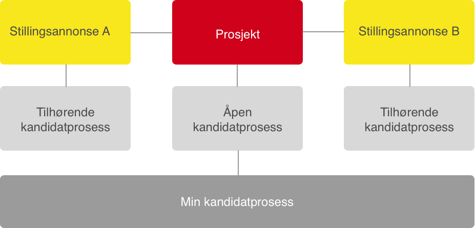 I tillegg viser kandidatprosessen på prosjektet de ulike kandidatene som er i prosesser på alle de ulike stillingene som er knyttet til prosjektet. Kandidatprosessen på prosjektet viser altså en samlet (aggregert) visning av alle kandidater i prosess på alle stillingsannonsene + alle kandidatene knyttet direkte til prosjektprosessen. Med bakgrunn i figuren som illustrerer systemet, vil en prosjektprosess vise Kandidater i prosess på stillingsannonse A, Stillingsannonse B og selvfølgelig alle kandidater i den åpne prosjektprosessen.