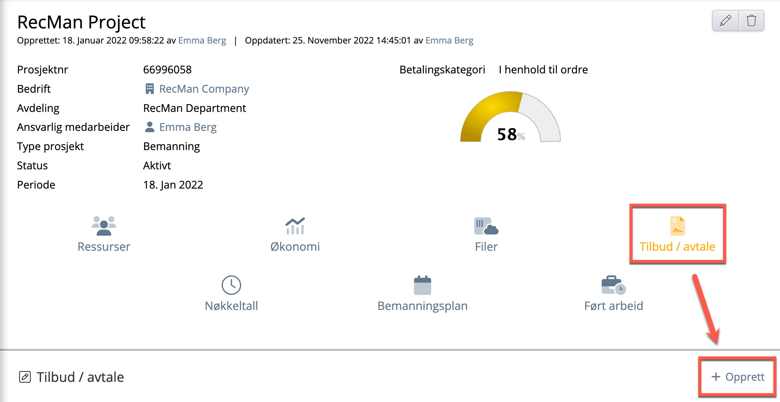 Inne på et prosjekt har RecMan en funksjon som lar deg generere tilbud / avtaler elektronisk, slik at du slipper å lage dokumenter i et eksternt program for å sende dette til kunden. Disse tilbudene / avtalene er i stor grad basert på maler, og du kan f.eks. generere et tilbud som ligger online for gjennomsyn av kunden, og du kan til og med gjøre endringer mens kunden ser på. Når alt er ok, kan kunden signere elektronisk minst like sikkert som en tradisjonell signatur. Fordelen er at alle sparer masse tid.