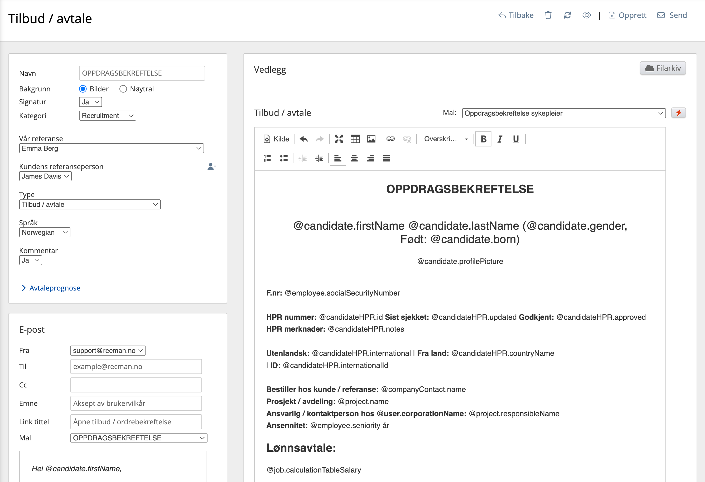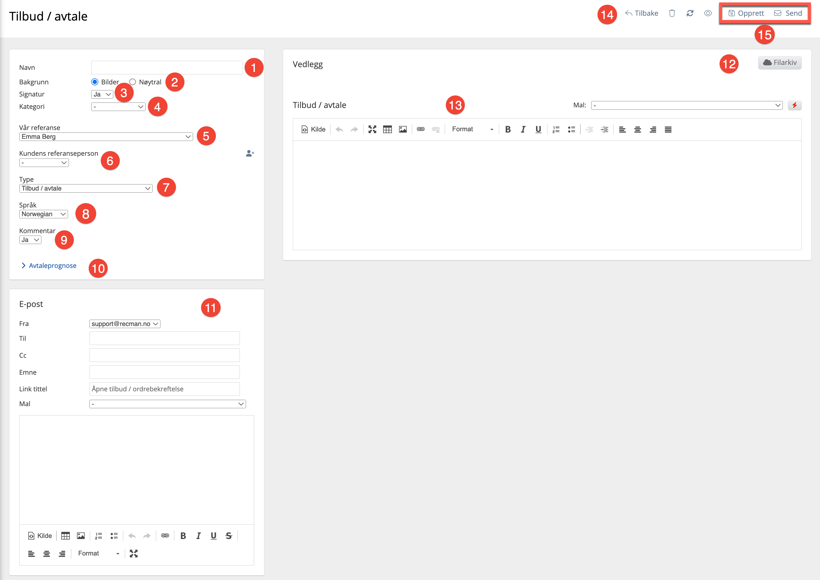 - Her oppretter man e-posten som følger med tilbudet / avtalen. Det er mulig å bruke meldingsmaler (med fletting) her for å standardisere meldingene man legger ved tilbudene, slik at man slipper å skrive disse manuelt for hver gang.