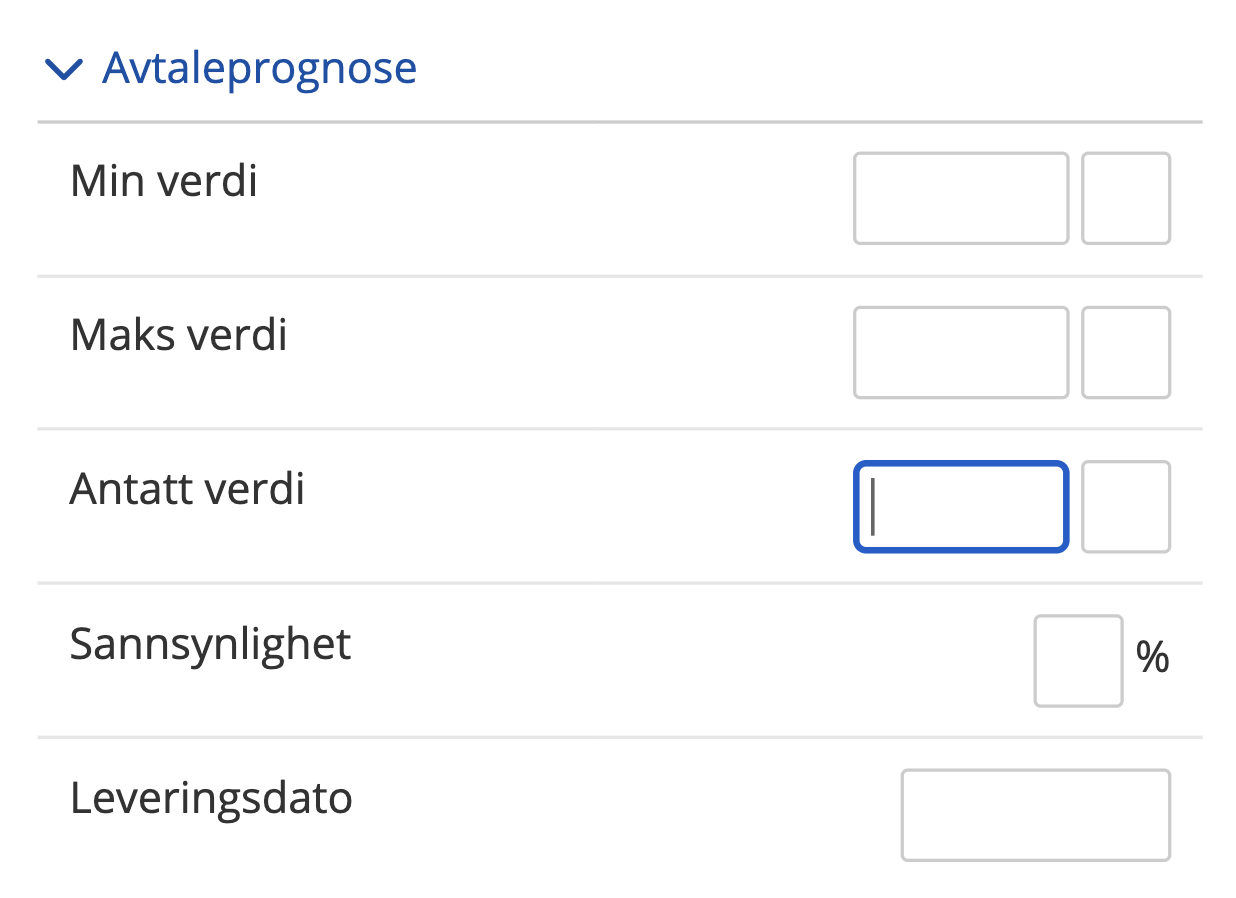 I avtaleprognosen er man nødt til å definere en leveringsdato, ellers vil man ikke kunne ta ut periodiserte rapporter. Det er også påkrevd å skrive inn sannsynlighet for signering. Er dette feltet tomt vil sannsynligheten bli 0 % og man vil få nullsummer i rapportene. Når det gjelder verdiene man legger inn, er det påkrevd og enten bruke minimums verdi og maksimums verdi sammen (å la antatt verdi stå tomt), eller skrive inn antatt verdi (å la minimum og maksimums verdi stå tomt). Det kan være greit å fylle inn all informasjon.
