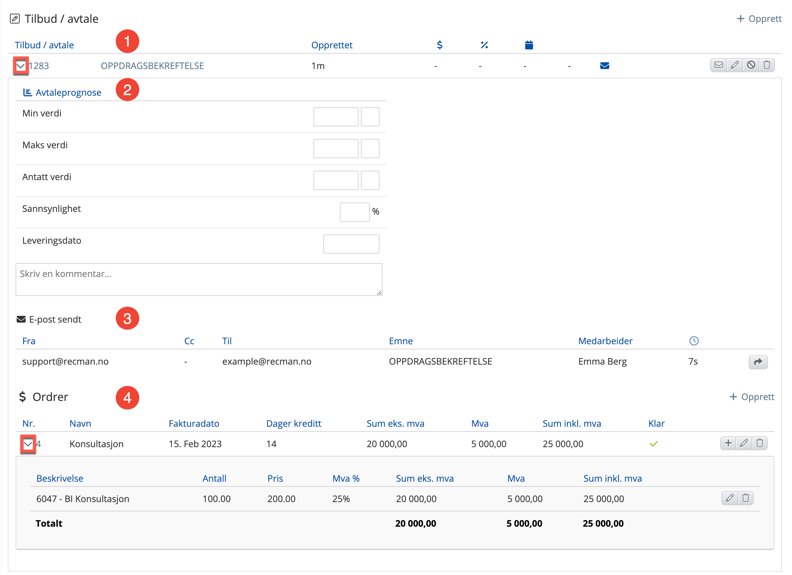 - Det som ligger under avtaleprognose er de tallene man registrerte når man opprettet tilbudet / avtalen. Disse kan man også endre på her, og man har mulighet til å legge til kommentarer. Man kan også se hvem som har åpnet tilbudet / avtalen, dato det ble gjort og hvilken IP-adresse det ble gjort ifra.
