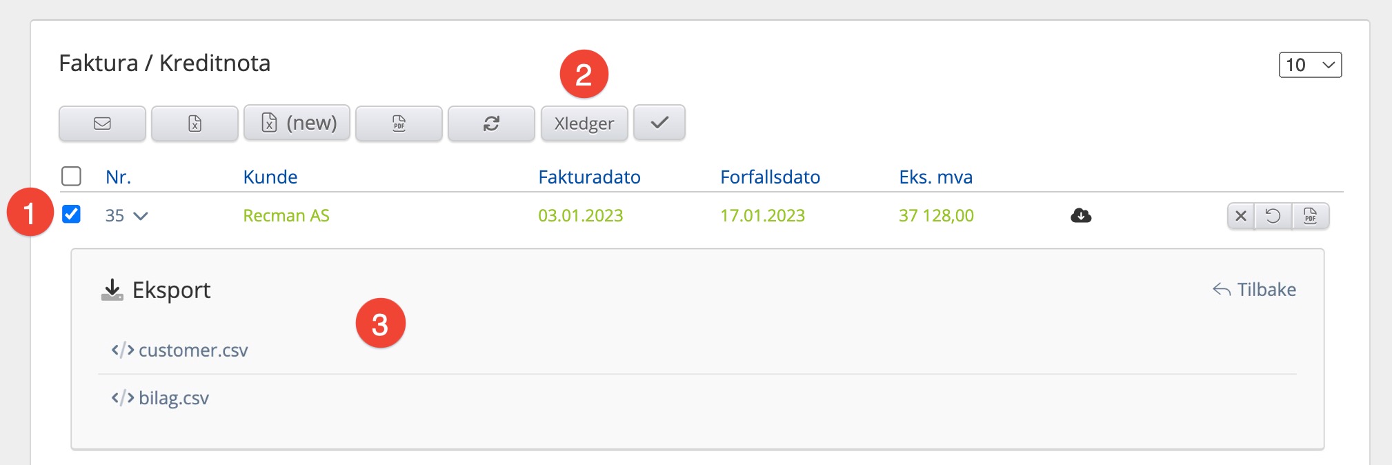 Gå til Systeminnstillinger → Økonomi → Fakturaeksport og huk av for Xledger som valg for fakturaeksport. Da vil Xledger dukke opp som et valg i fakturaoversikten når man har huket av aktuelle fakturaer.