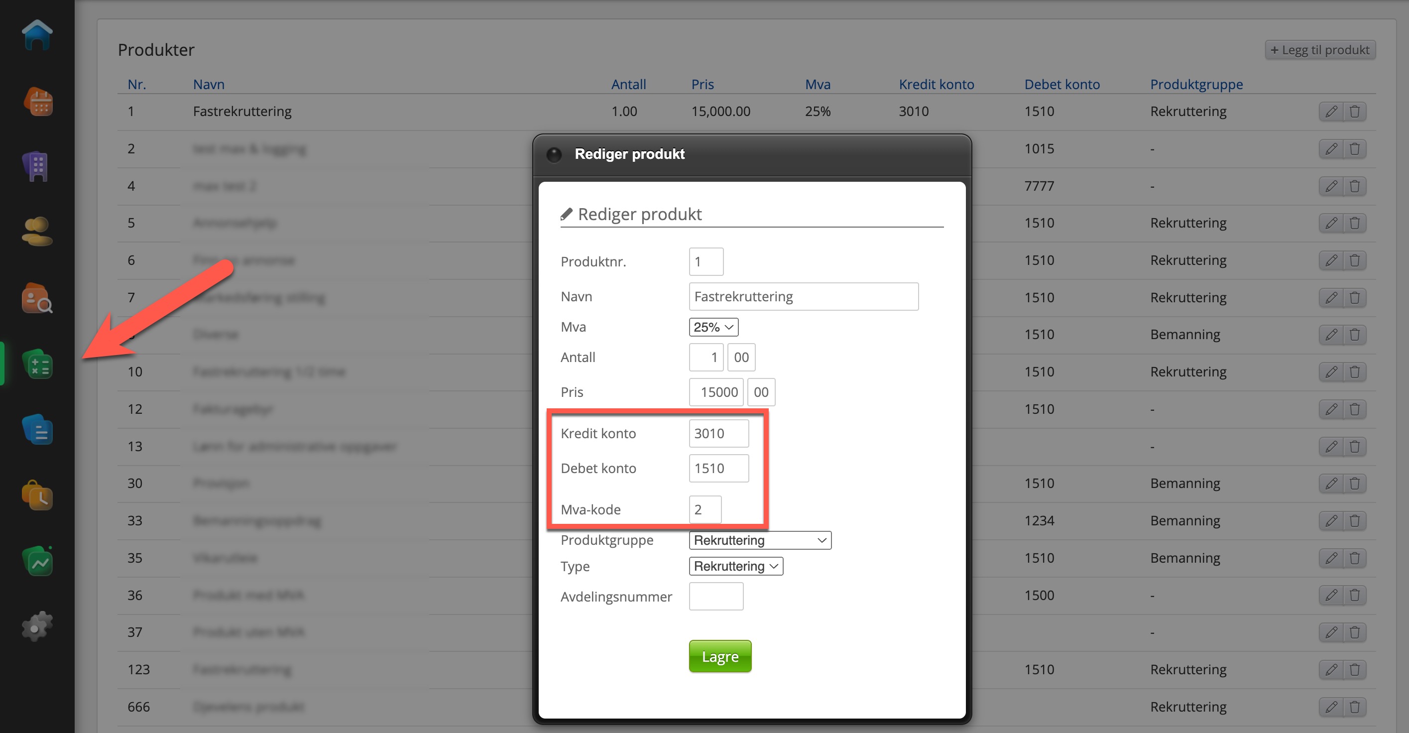 Det siste man gjør i produktoversikten er å legge til MVA-konto, dette feltet finner dere under selve oversikten av produktene.