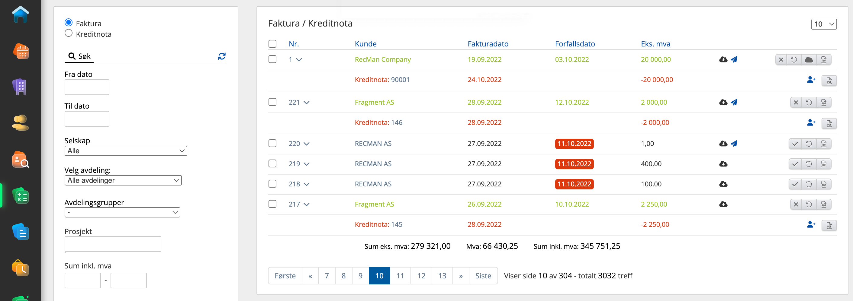 Inne i fakturaoversikten finner du alle fakturaer som er generert i systemet. Her kan du filtrere (venstre side på skjermen) på dato, selskap, avdelinger, prosjekt, fakturasum etc. Du kan også søke på fakturanummer eller kunde. For helt presise søk på navn, kundenummer og fakturanummer i fakturaoversikten kan man bruke enkelte kodesnutter (ta bort gåseøynene fra eksemplene nedenfor).