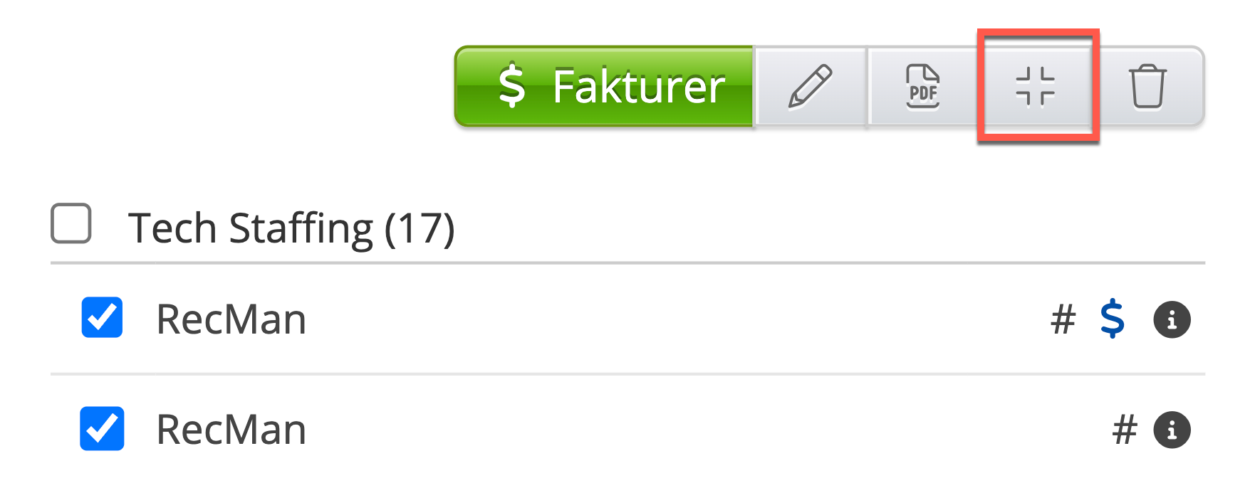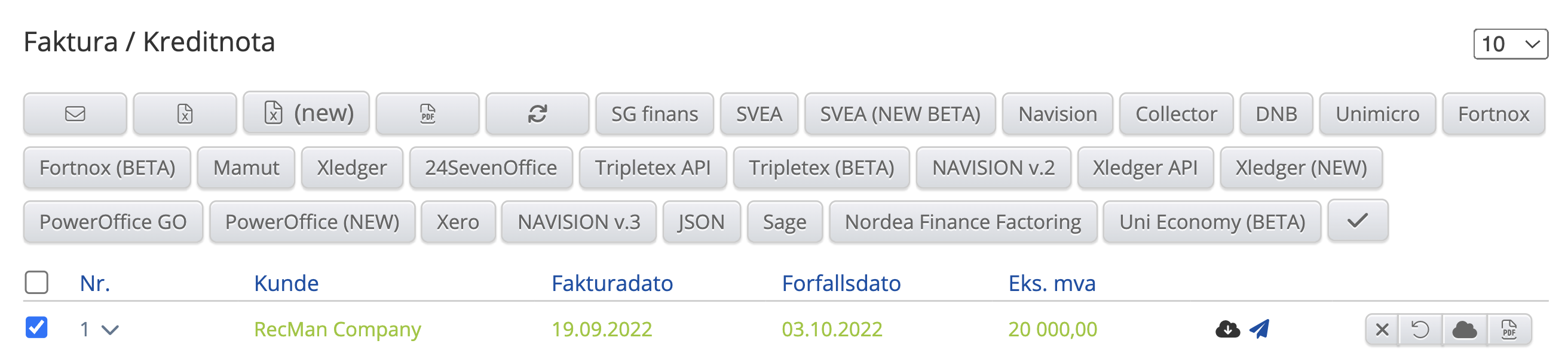 Ikonene i raden til høyre kan endre seg avhengig av hva som har skjedd med fakturaene. Som du ser har det dukket opp en del tilleggsikoner her.