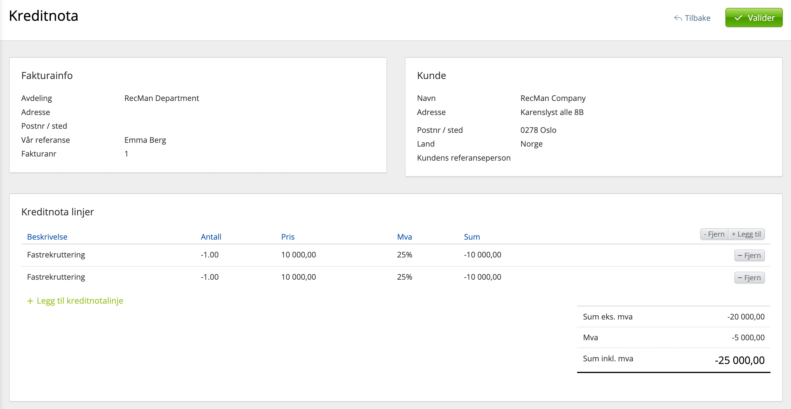 Klikk deretter Valider-knappen, velg dato for kreditnota (påvirker hvilken periode/måned krediteringen legger seg på i rapporter) og så Opprett kreditnota for å opprette kreditnota. Kreditnotaen finner du igjen i fakturaoversikten i linjen under fakturaen du krediterte (se bilde nedenfor). Ønsker du å også sende kreditnotaen på e-post så filtrerer du først på kreditnota i filtermenyen til venstre, for så å huke av på kreditnotaen du ønsker å sende.