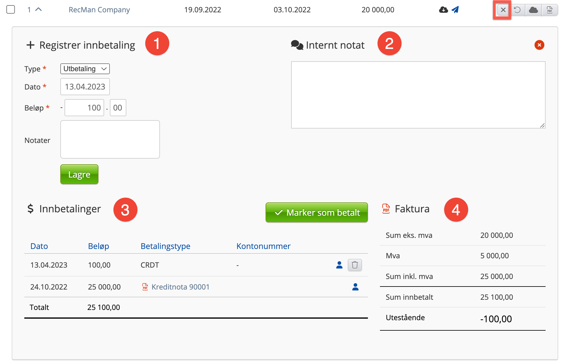 - I dette feltet vises fakturasummene i sin helhet. Ekskl. mva, mva, inkl. mva også får du i de to siste feltene oversikt over hva som er innbetalt og eventuelt hva som er utestående. I tilfellet over har vi en faktura på 25 000 kr der vi har registrert en delinnbetaling den 13.04.2023 pålydende 100 kr dvs. at denne fakturaen har et utestående beløp på 25 100 kr.