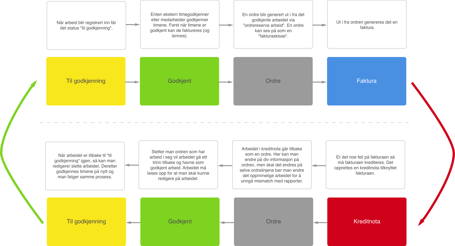 Den nederste linjen viser hva du må gjøre om du skal endre på timene etter det er opprettet faktura på dem. Timene det gjelder må krediteres, ordren må slettes og de må settes til Til godkjenning. Når endringen er gjort, gjennomfører man den øverste prosessen igjen.