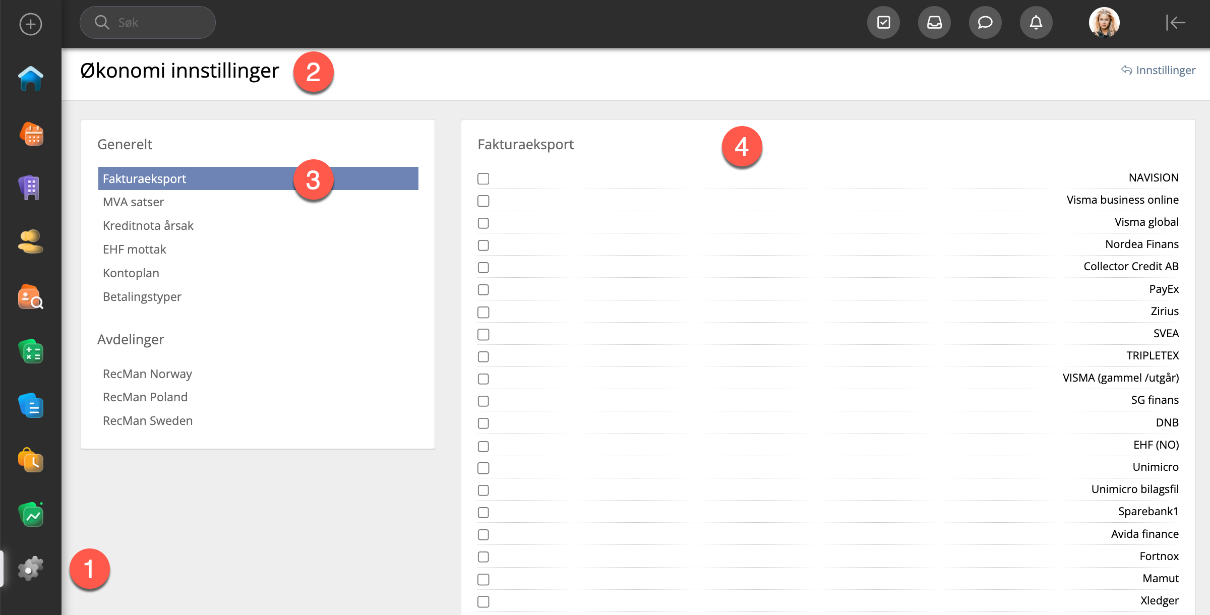 For å kunne sende faktura på EHF må det foreligge en egen avtale med RecMan. For å aktivere dette, gå til