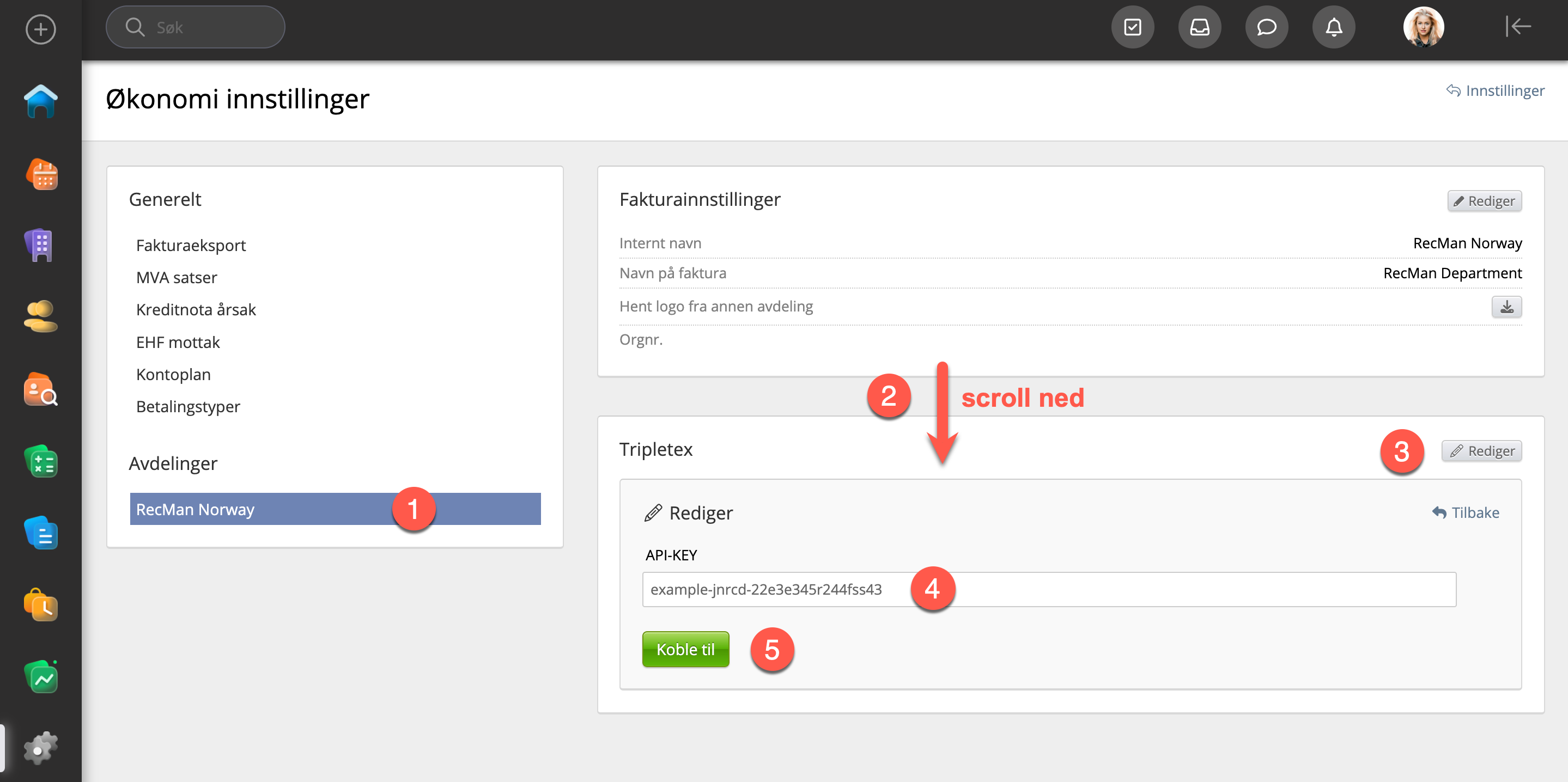 Når du har fått generert en API-nøkkel i Tripletex så går du inn i RecMan og videre til Systeminnstillinger → Økonomi. Her trykker du på fakturaeksport og huker av for Tripletex API.