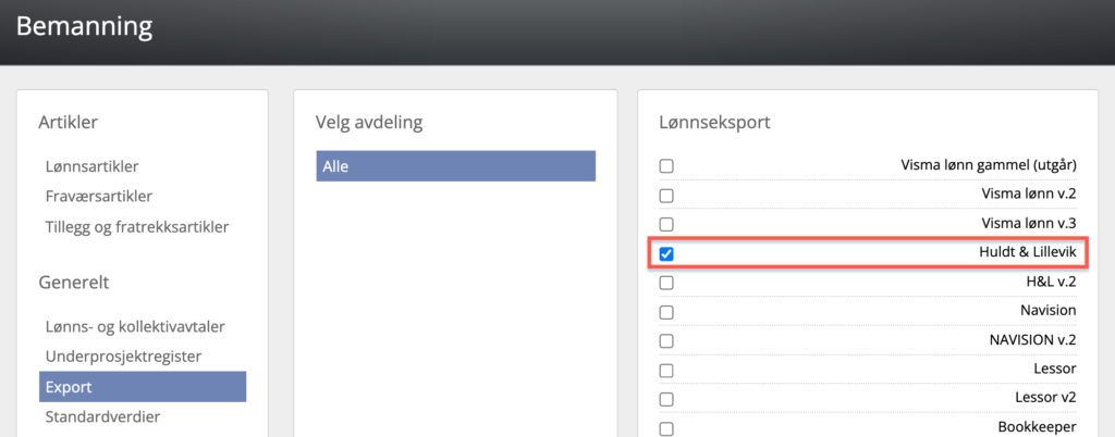Gå til Systeminnstillinger → Bemanning → Eksport → Velg avdeling(er) = Alle → huk av for Huldt & Lillevik (H&L). Da vil H&L dukke opp som et alternativ når man skal eksportere lønnsgrunnlag i RecMan.