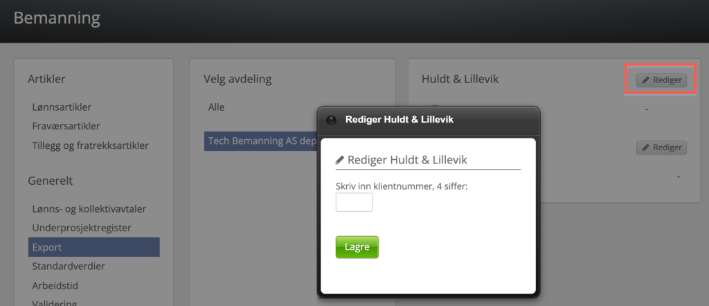 Man setter klientnummer for H&L på samme sted som ovenfor, men isteden for at Velg avdeling = Alle, så trykker du på en spesiell avdeling. Da får du mulighet til å legge inn klientnummer for H&L om du trykker på Rediger-knappen i boksen.