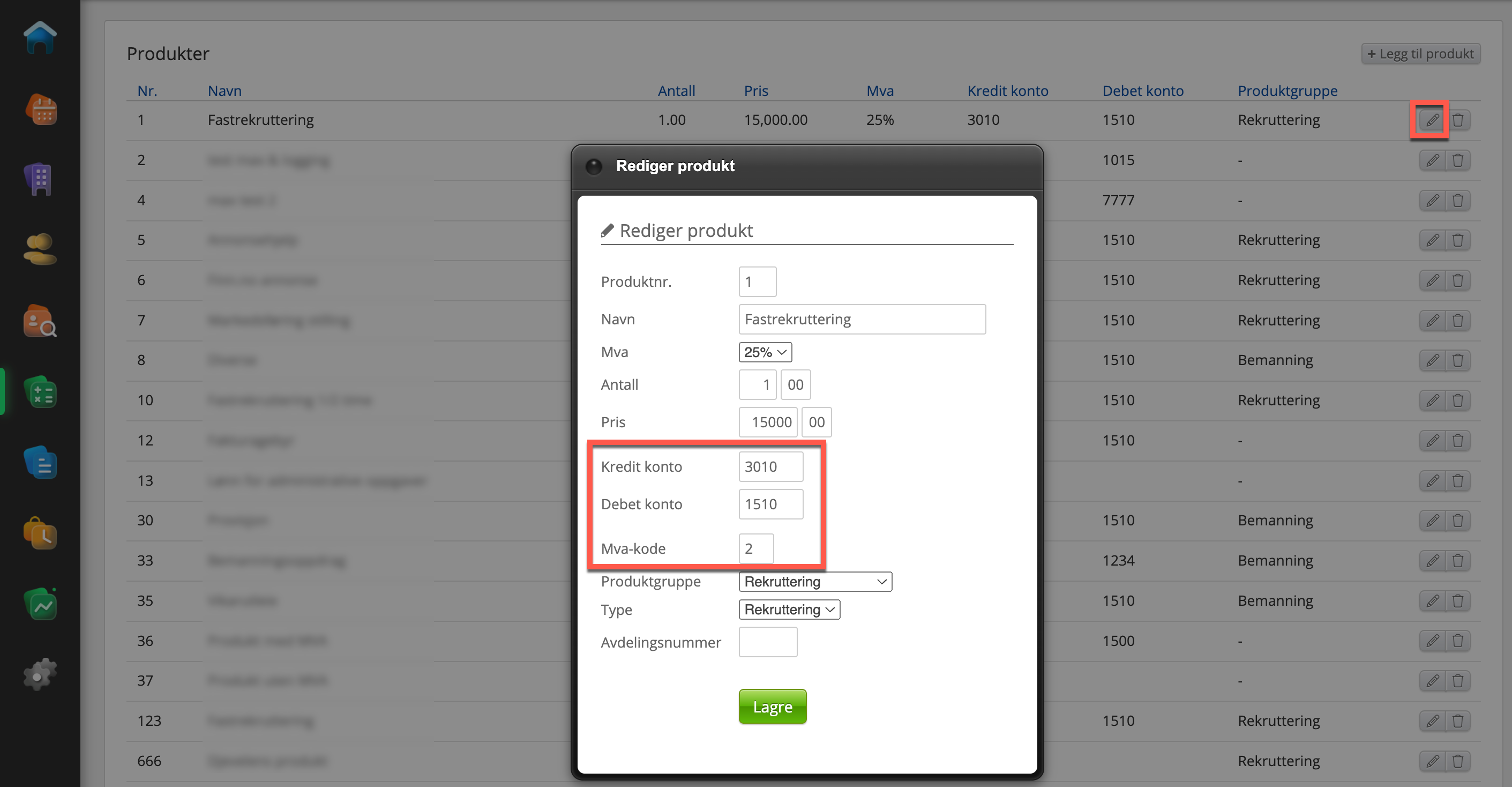 For at få en korrekt overføring til Xledger trenger man at stille in produkter i RecMan så de samsvarer med oppsett som gjelder i Xledger.