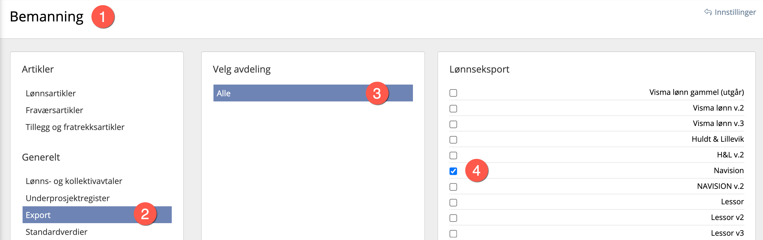 Gå til Systeminnstillinger → Bemanning → Eksport → Velg avdeling(er) → huk av for Navision. Da vil Navision dukke opp som et alternativ når man skal eksportere lønnsgrunnlag i RecMan.