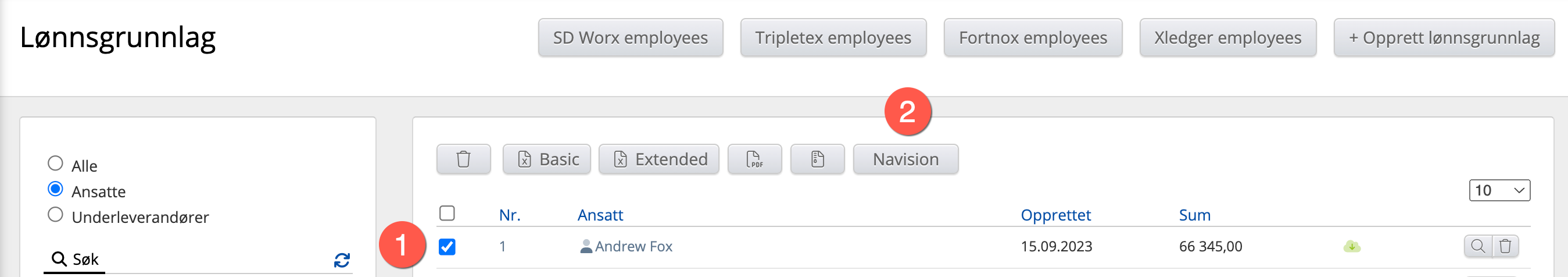 Når du da går i oversikten over lønnsgrunnlagene man har opprettet i systemet (finner disse i Prosjekter → Lønnskjøring → Lønnsgrunnlag).