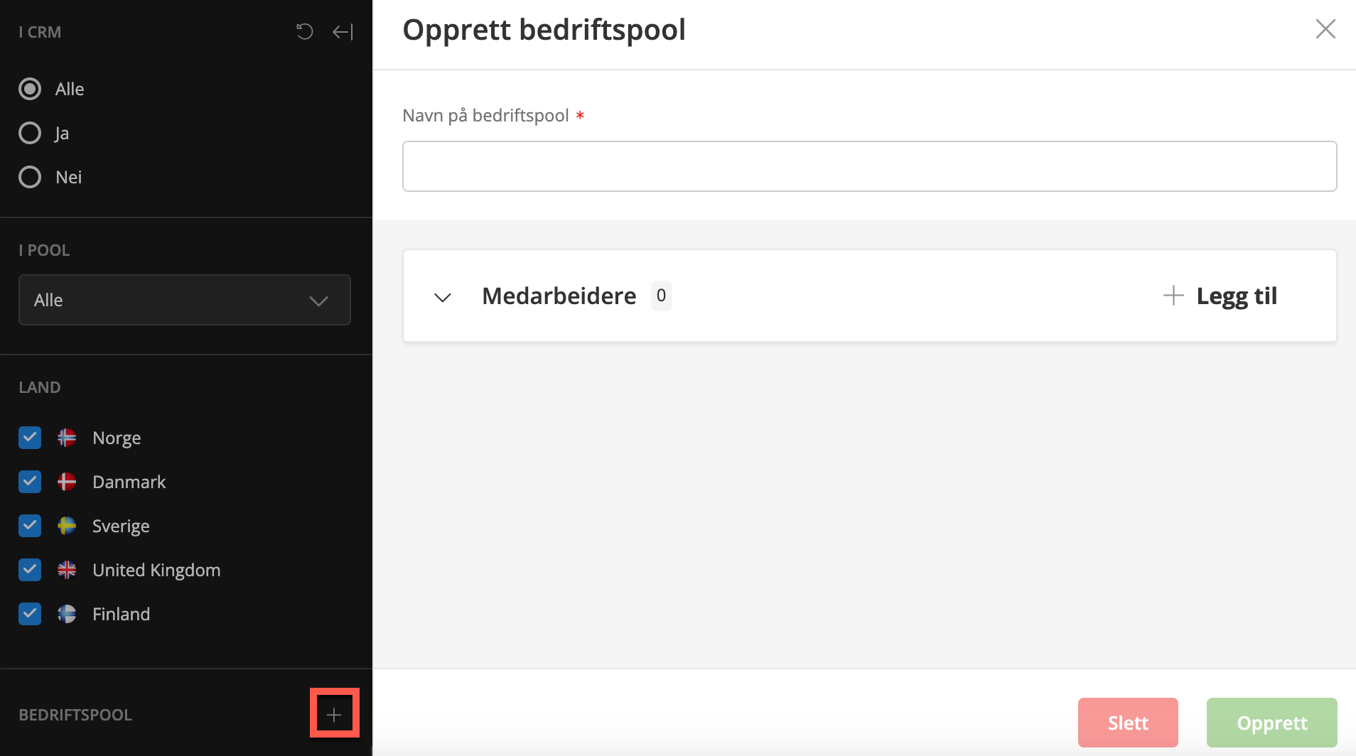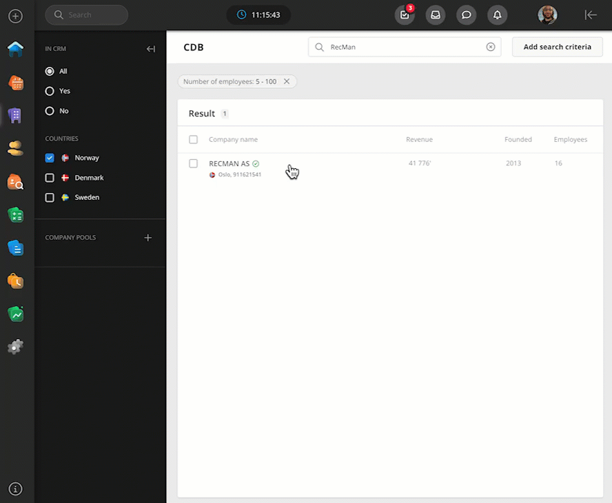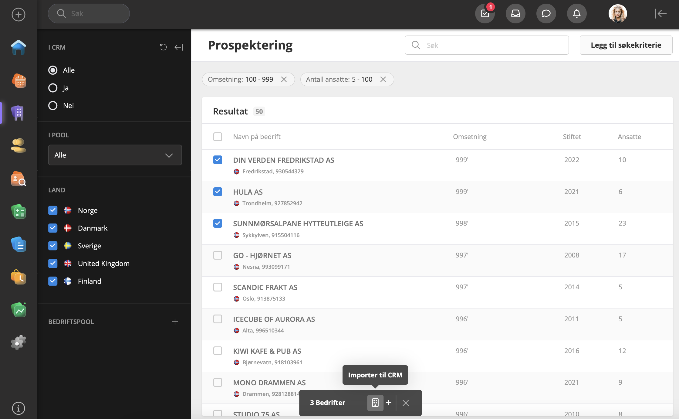 I CDB-modulen får du først en oversikt over selskapene i listen, hvor du kan filtrere på om de allerede finnes i CRM, er lagt til poolen og hvilket land det skal vises for. De tilgjengelige landene er Norge, Danmark, Sverige, Storbritannia og Finland. Ved å velge et selskap kan du klikke for å importere det til CRM:
