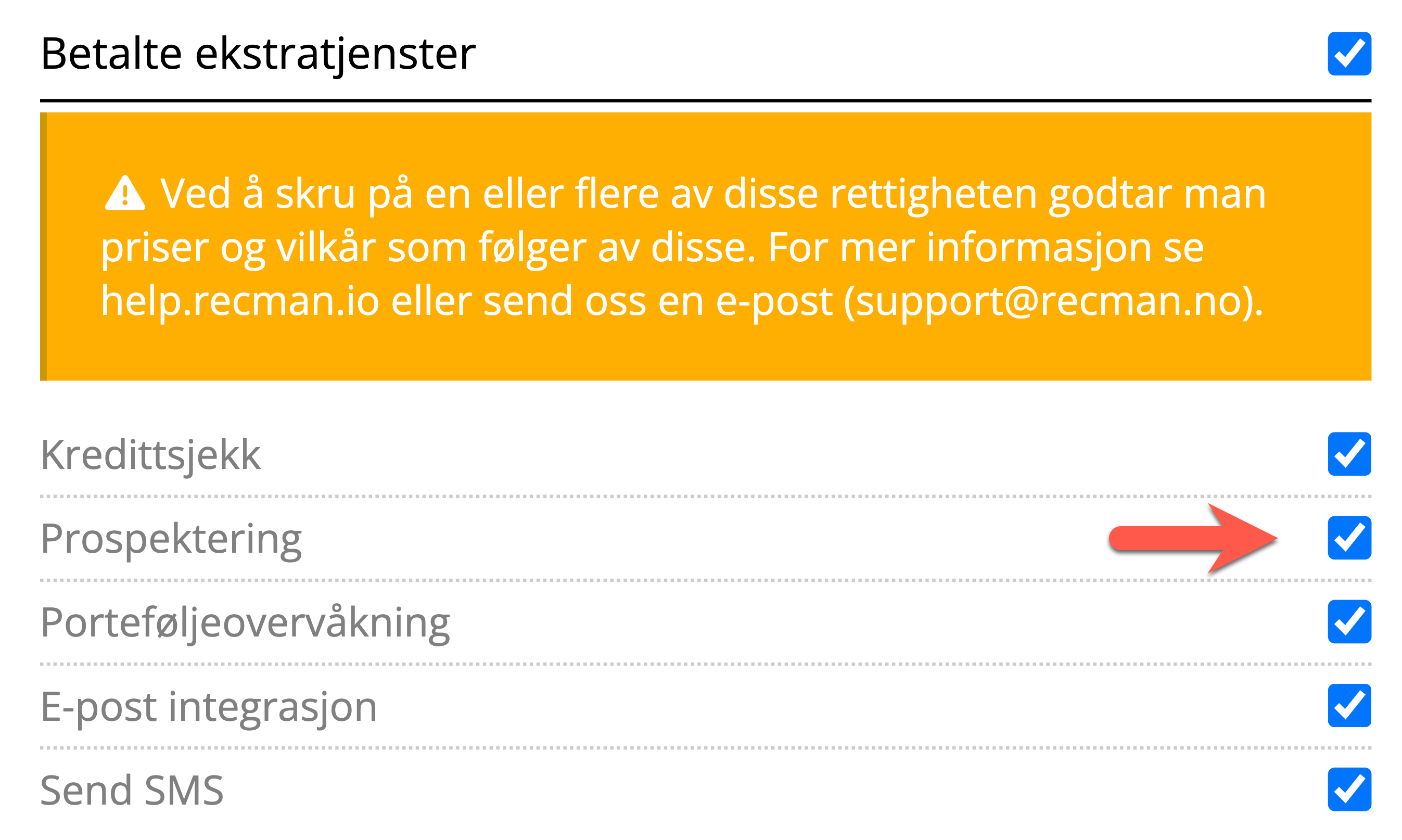 For å aktivere prospektering må du være en RecMan administrator. Deretter kan du aktivere CDB under Betalte ekstratjenester i Brukerinnstillinger (Innstillinger → Medarbeidere), hvor den kan aktiveres per medarbeider.