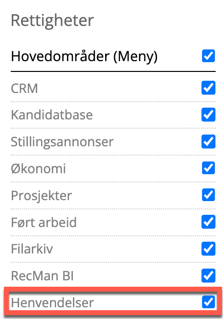 Henvendelsemodulen skrus på som en rettighet for hver bruker. I Systeminnstillinger → Medarbeidere → Rettigheter kan du gi tilgang til henvendelsesmodulen under Hovedområder-delen og også til innstillingene deres under Generelt-delen.