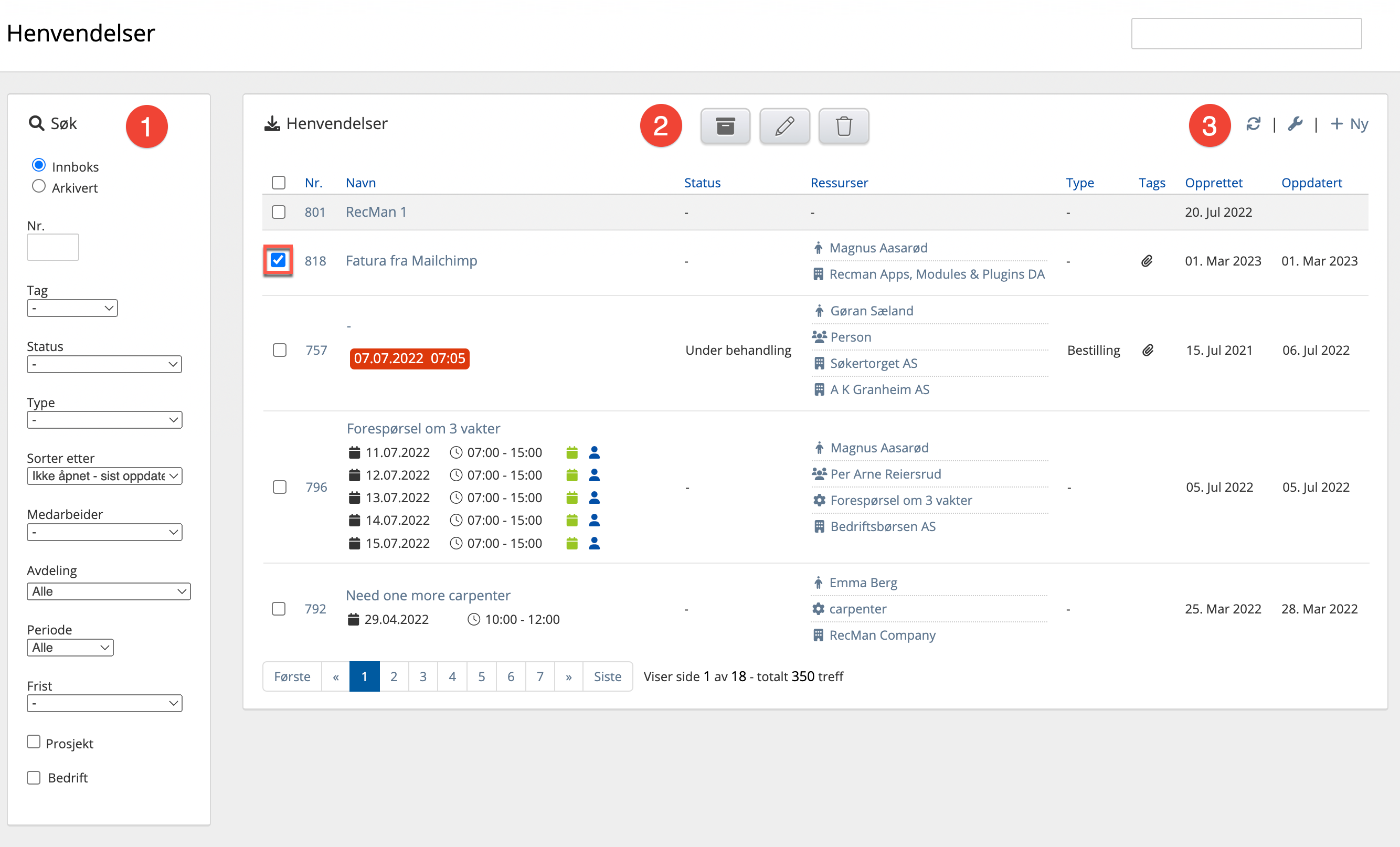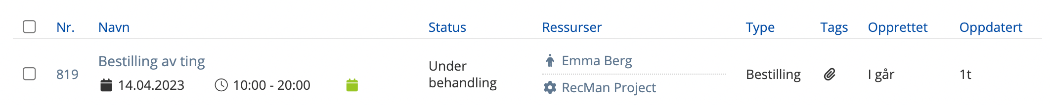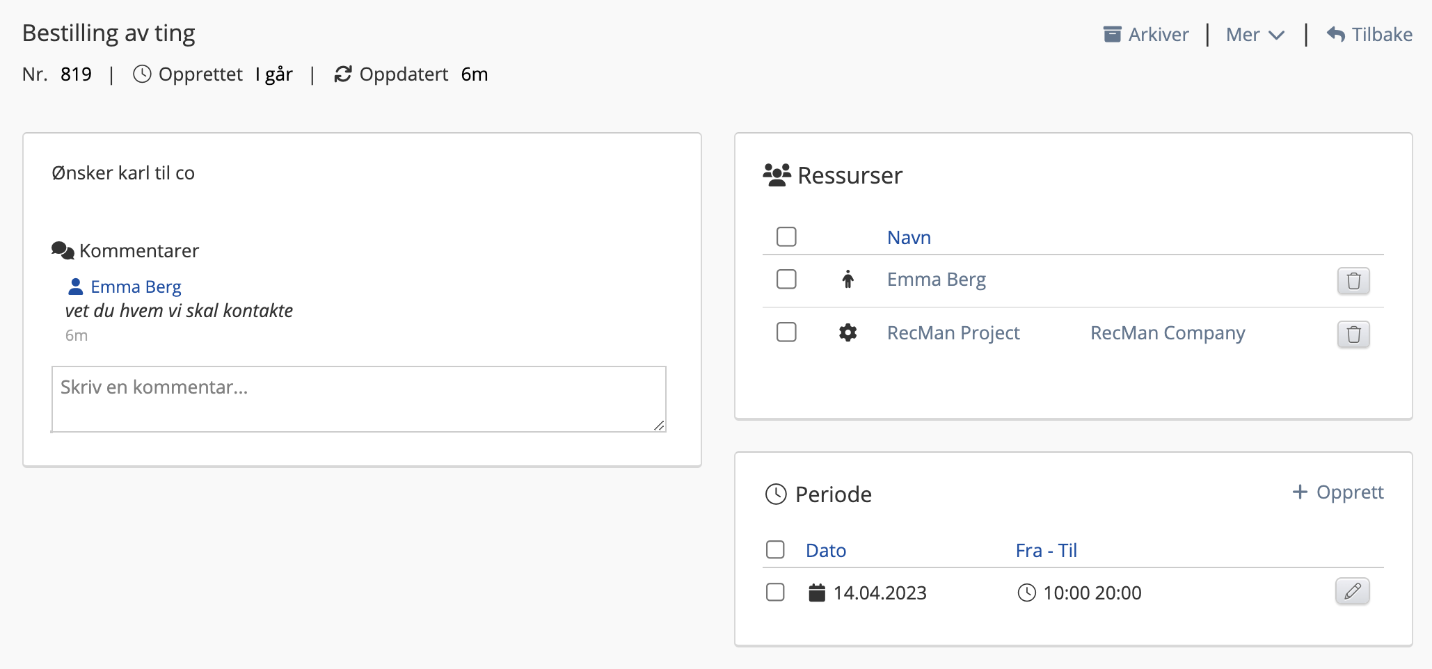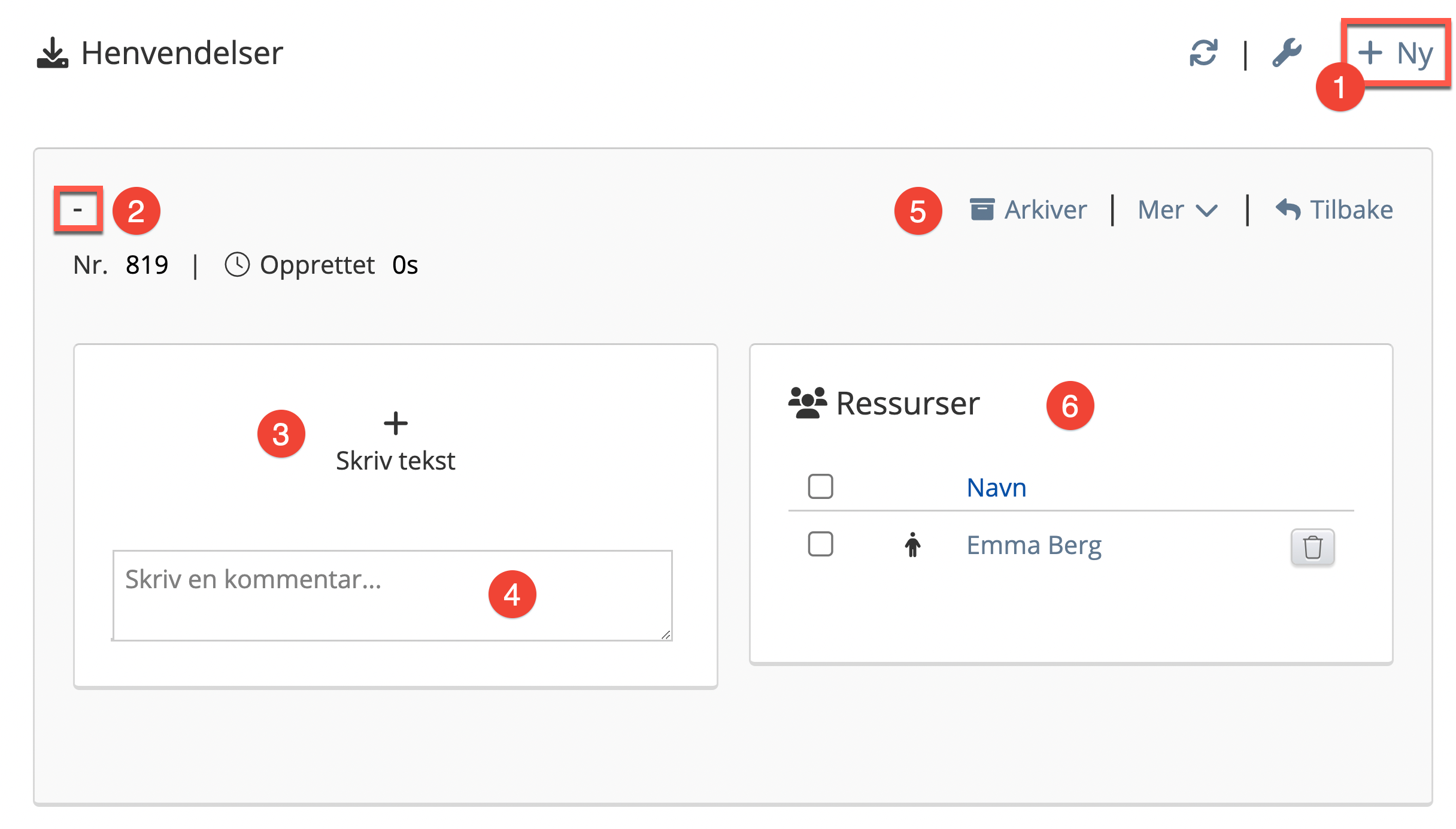 - Liste over alle ressurser man har knyttet til denne henvendelsen.