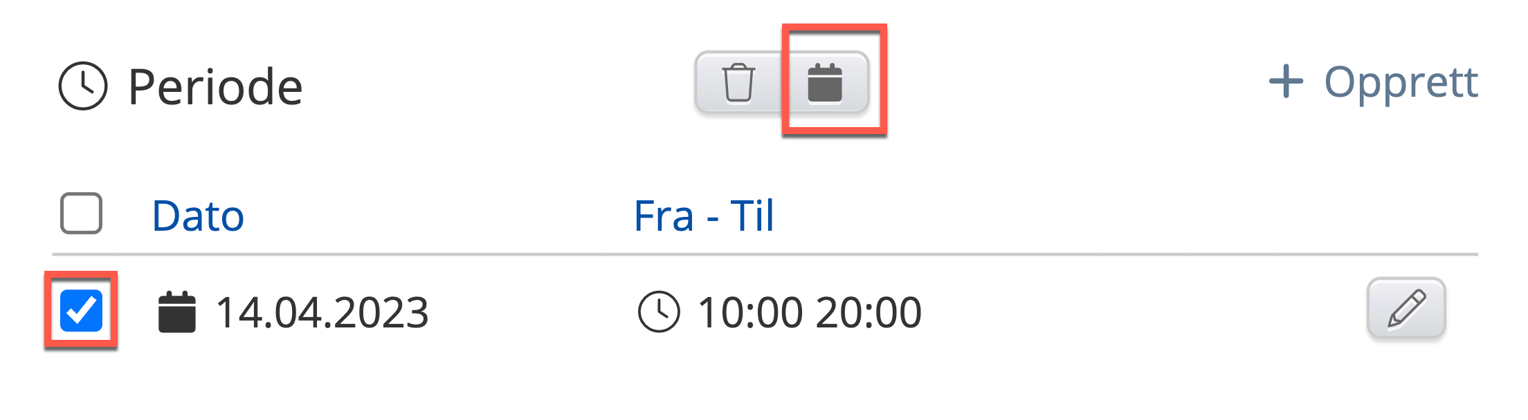 Da vil prosjektet komme i oversikten over ressursene man har knyttet henvendelsen til. I boksen under Ressurser finner man periodene henvendelsen gjelder for. Herfra kan man også opprette flere perioder, repetere perioder, redigere periodene eller slette de (søppelkassesymbol). Fra periodeoversikten kan du også opprette prosjektvakter, dette gjøres ved å hake av en eller flere perioder og trykk på kalenderknappen, Opprett prosjektvakt (se bildet nedenfor).